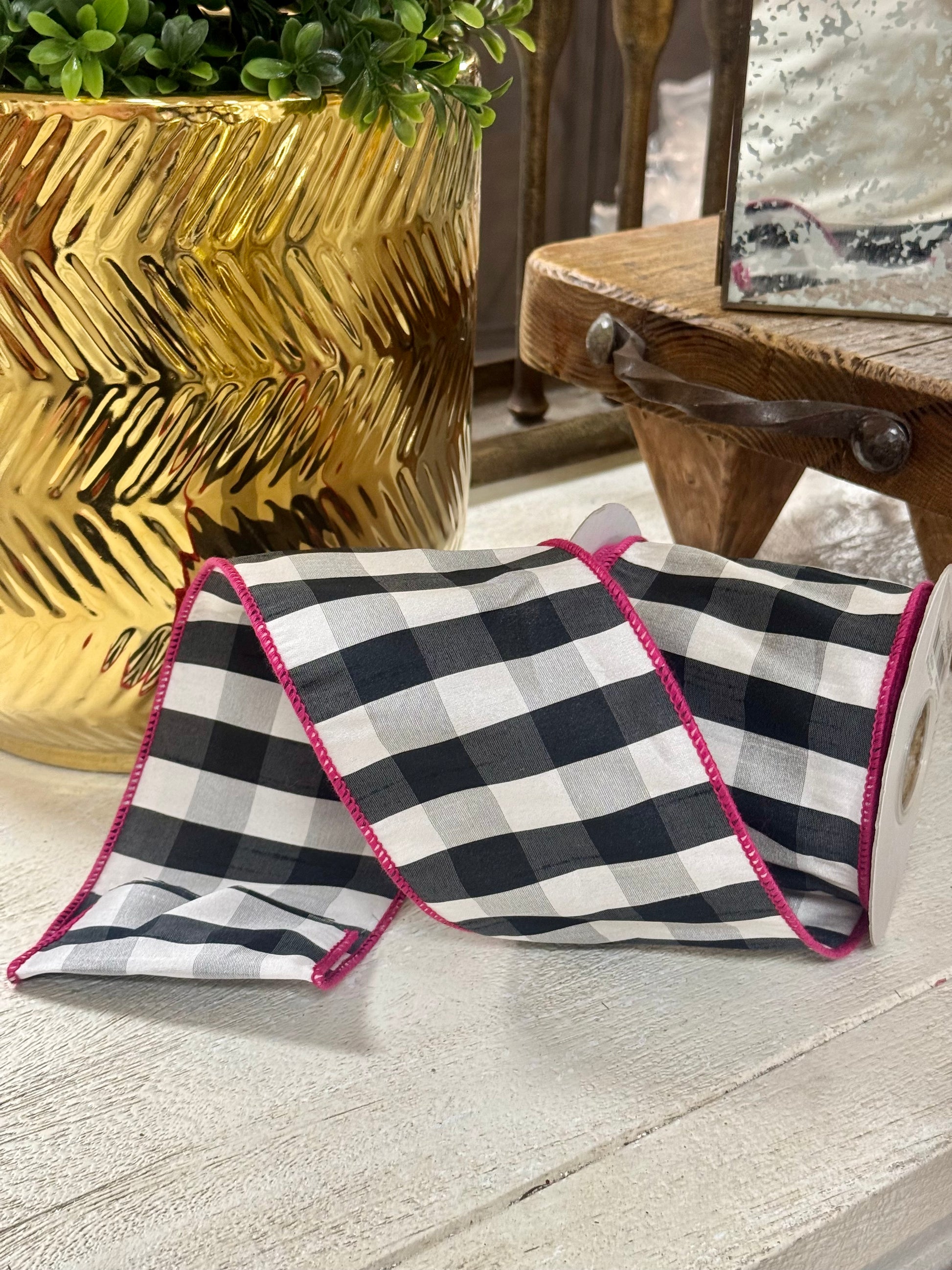 4 Inch By 10 Yard Black And White Gingham With Pink Edging Ribbon