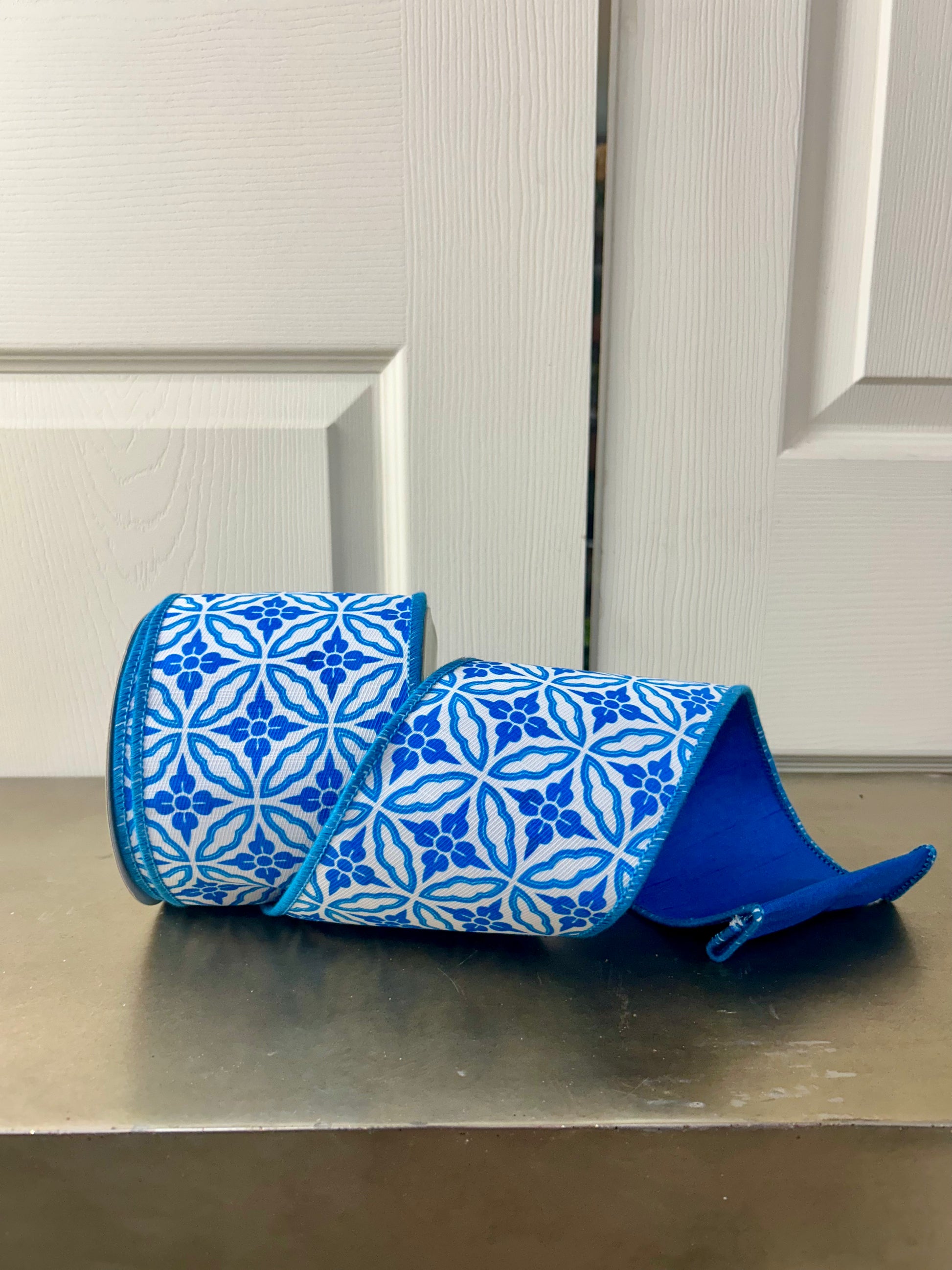 - This thick designer-quality ribbon is a double-sided delight. Two fabrics are fused together, creating a ribbon with premium structure. One side is a ribbed canvas printed with a blue geometric design that is reminiscent of Tuscan or Mediterranean tile. The other side is a rich, blue dupioni ribbon with subtle sheen. A little goes a long way - add a touch of this ribbon to elevate standard bows.