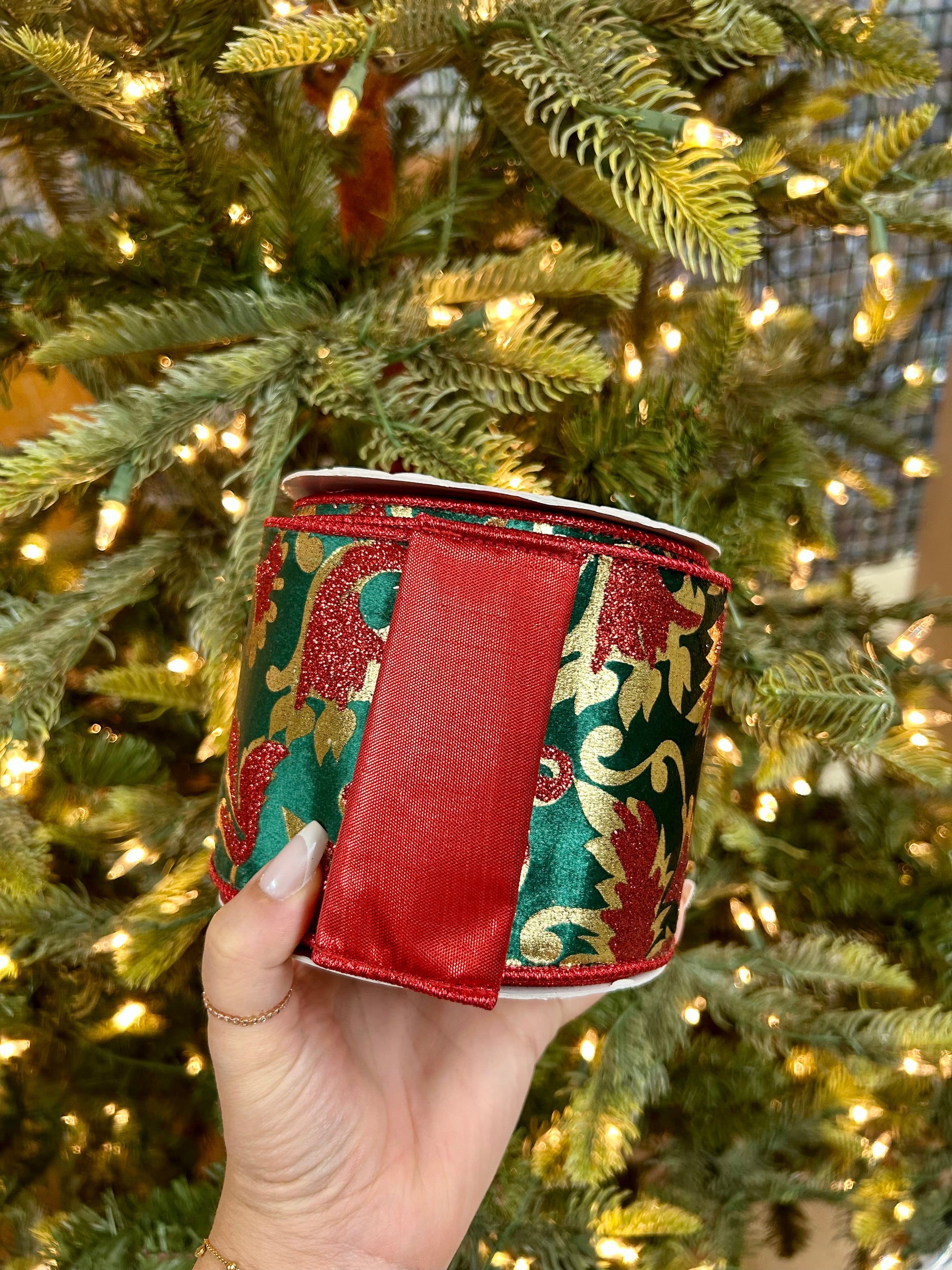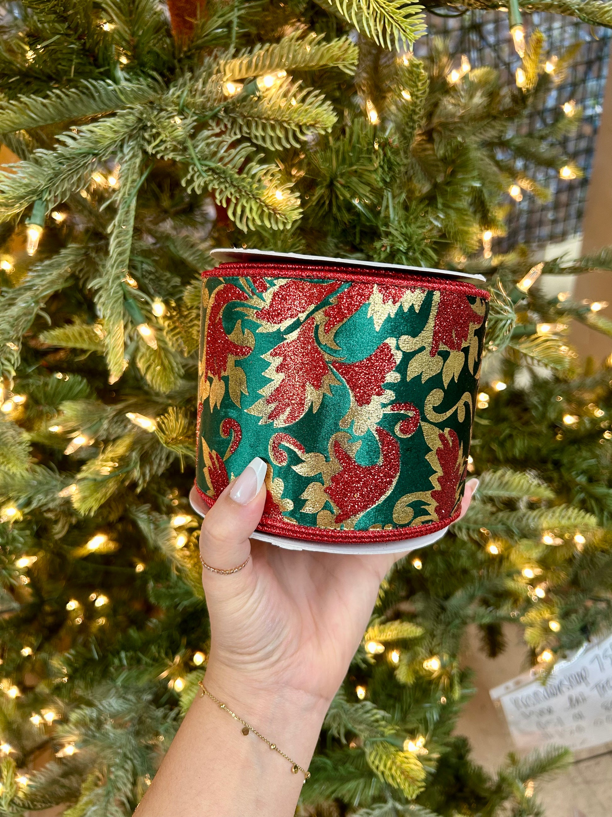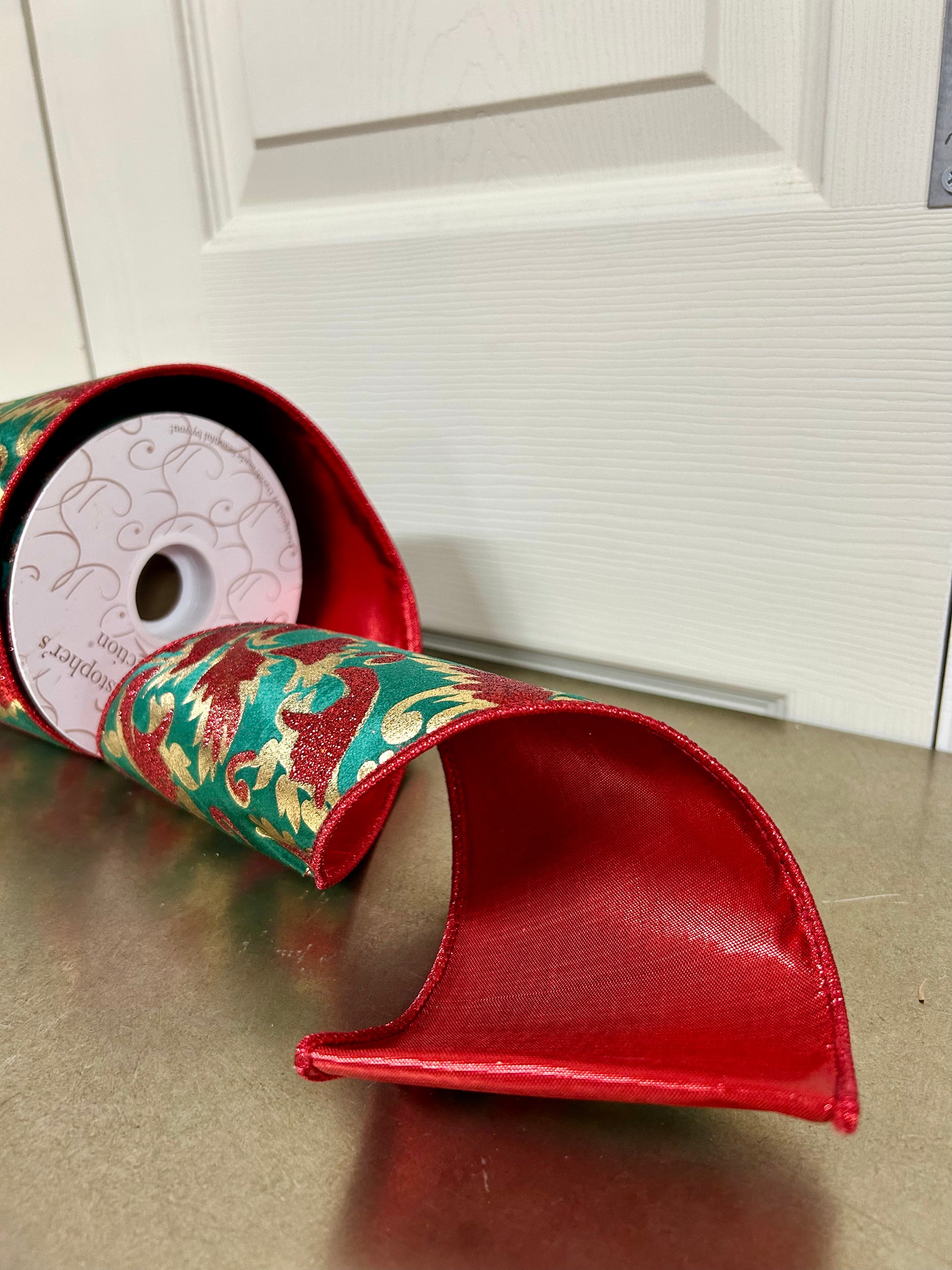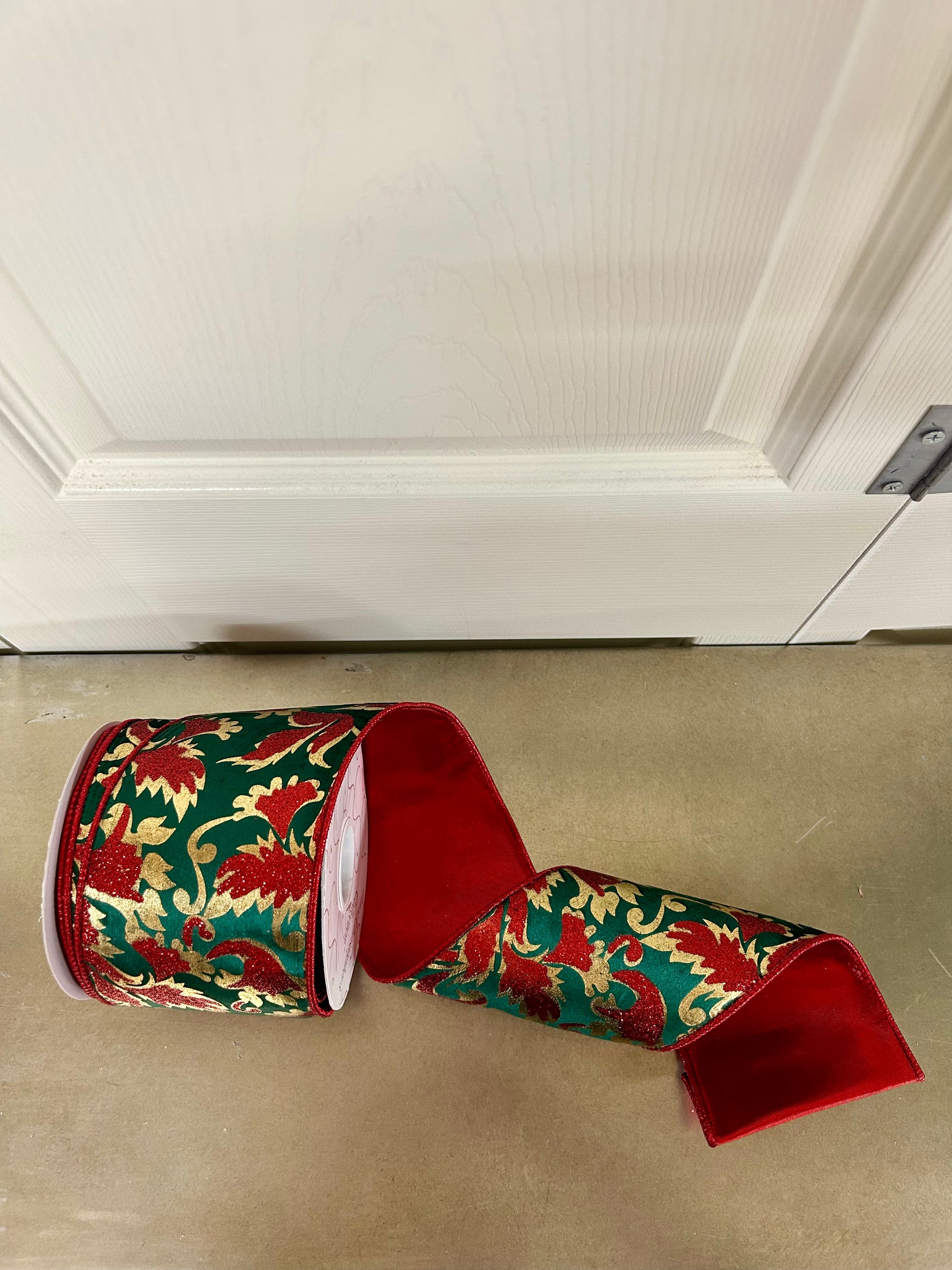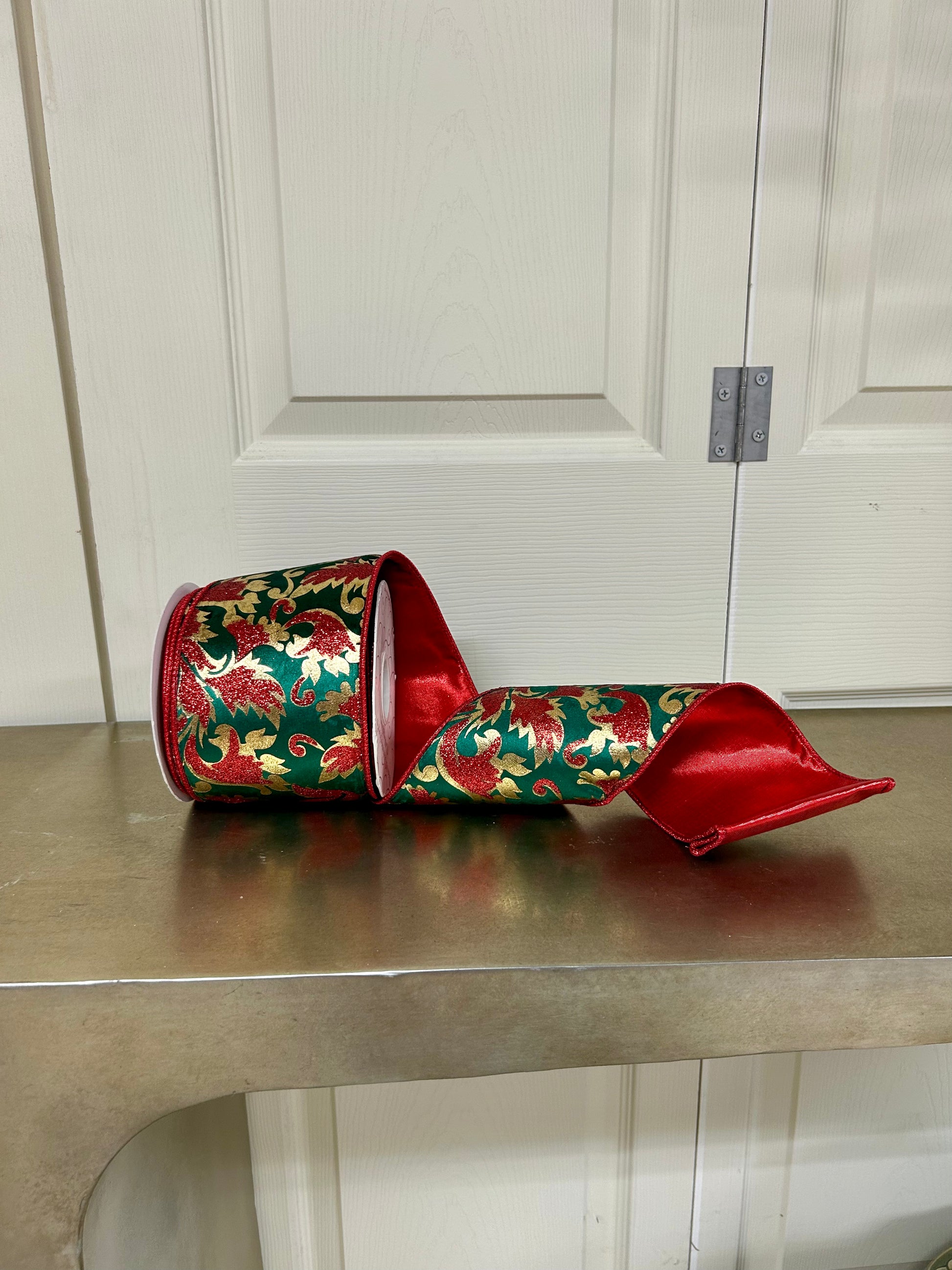 Elevate your holiday décor with this luxurious 4-inch by 10-yard ribbon featuring a gold glitter leaf pattern on rich dark green velvet. The vibrant red backing adds depth and contrast, perfect for crafting elegant Christmas wreaths, gift wrapping, or seasonal floral arrangements. This premium ribbon combines classic festive colors with a plush texture, ensuring your decorations stand out with sophistication and lasting appeal.