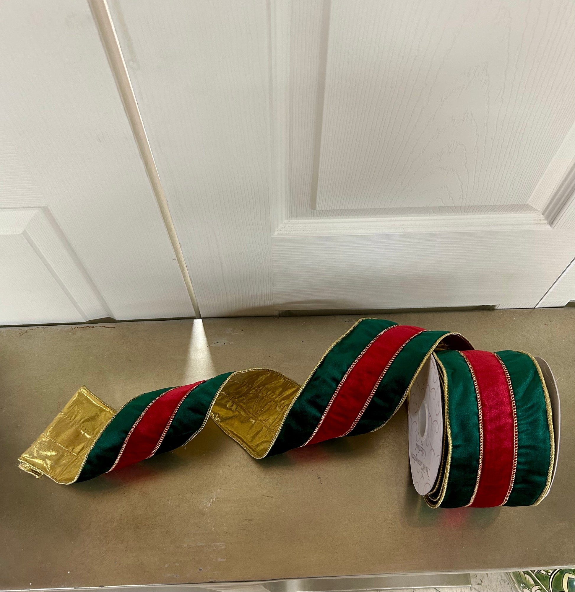 Elevate your holiday decor with this 4-inch by 10-yard ribbon featuring a sophisticated green velvet base, a striking red velvet center, and elegant gold edges with a gold backing. Designed for Christmas, this ribbon adds texture and richness to wreaths, garlands, and gift wrapping, providing a luxurious finish that enhances festive arrangements with depth and shimmer.