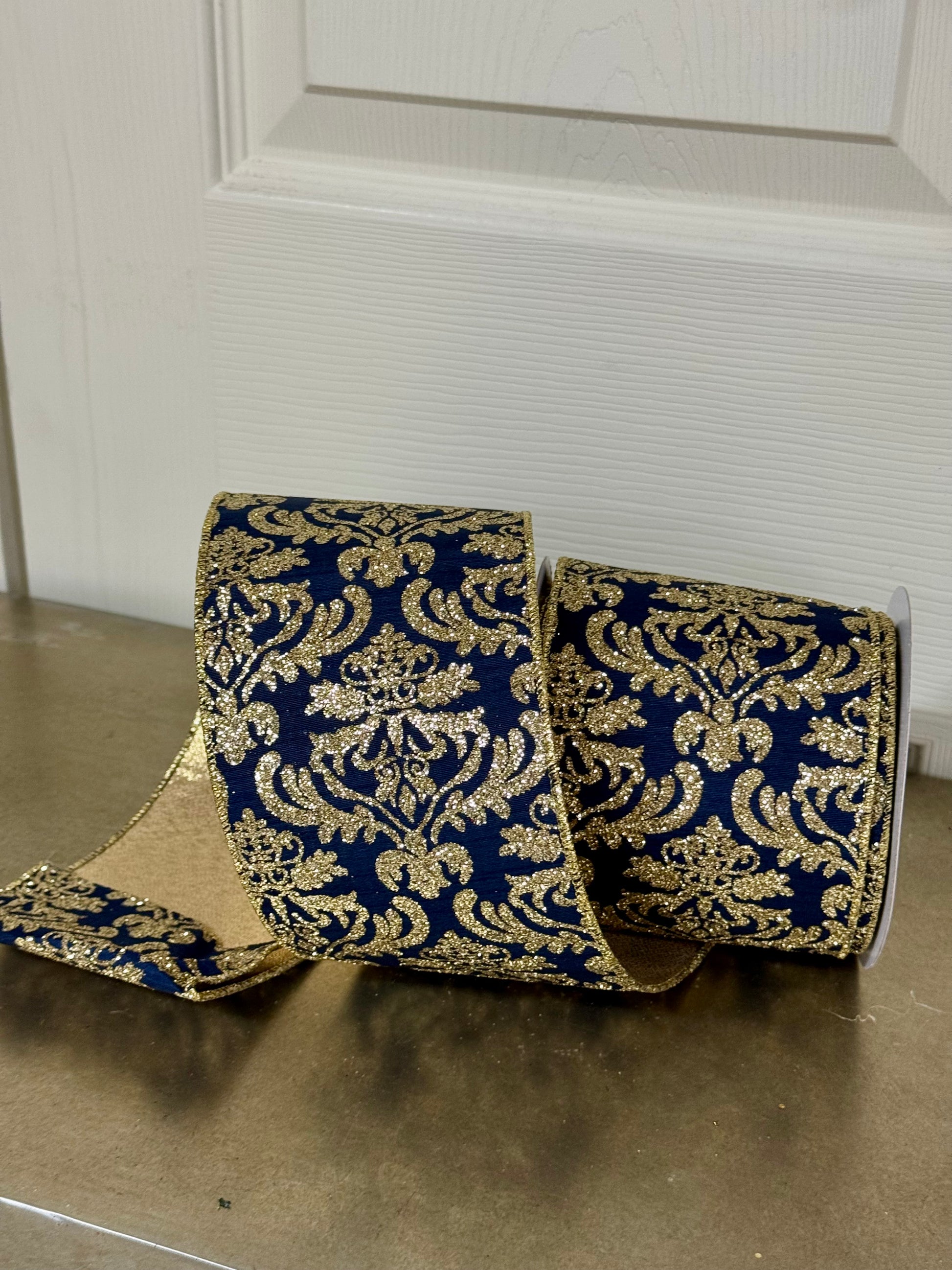 4 Inch By 10 Yard Navy Blue And Light Gold Damask Fused Back Ribbon