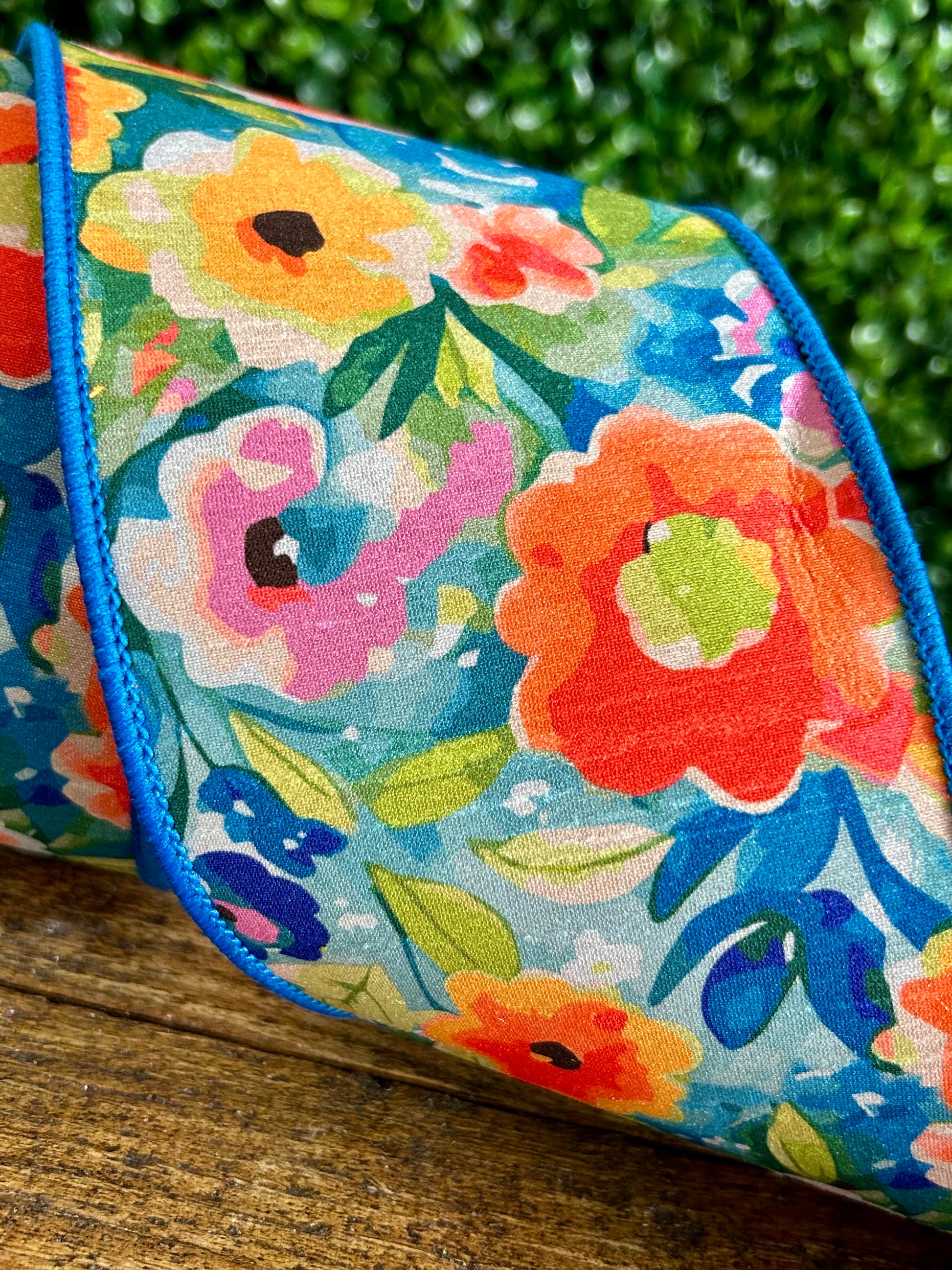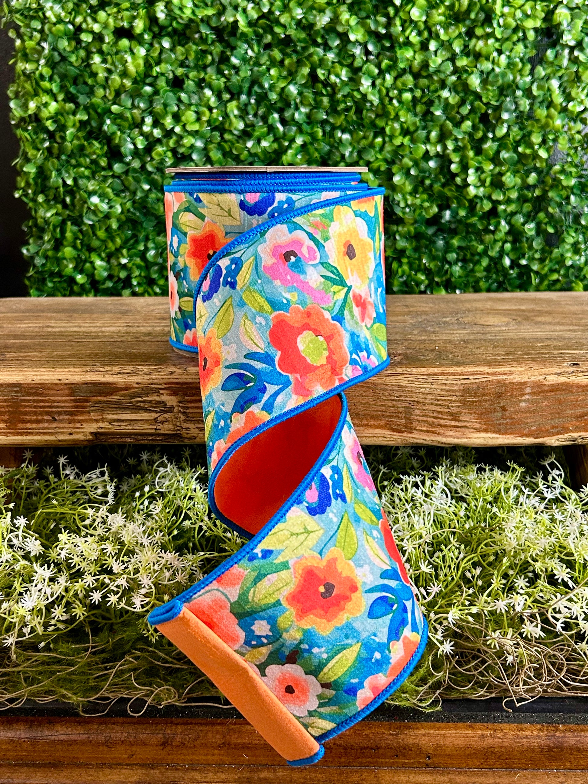 D. Stevens 4 Inch By 10 Yard Orange Blue And Green Watercolor Floral Garden Dupioni Ribbon