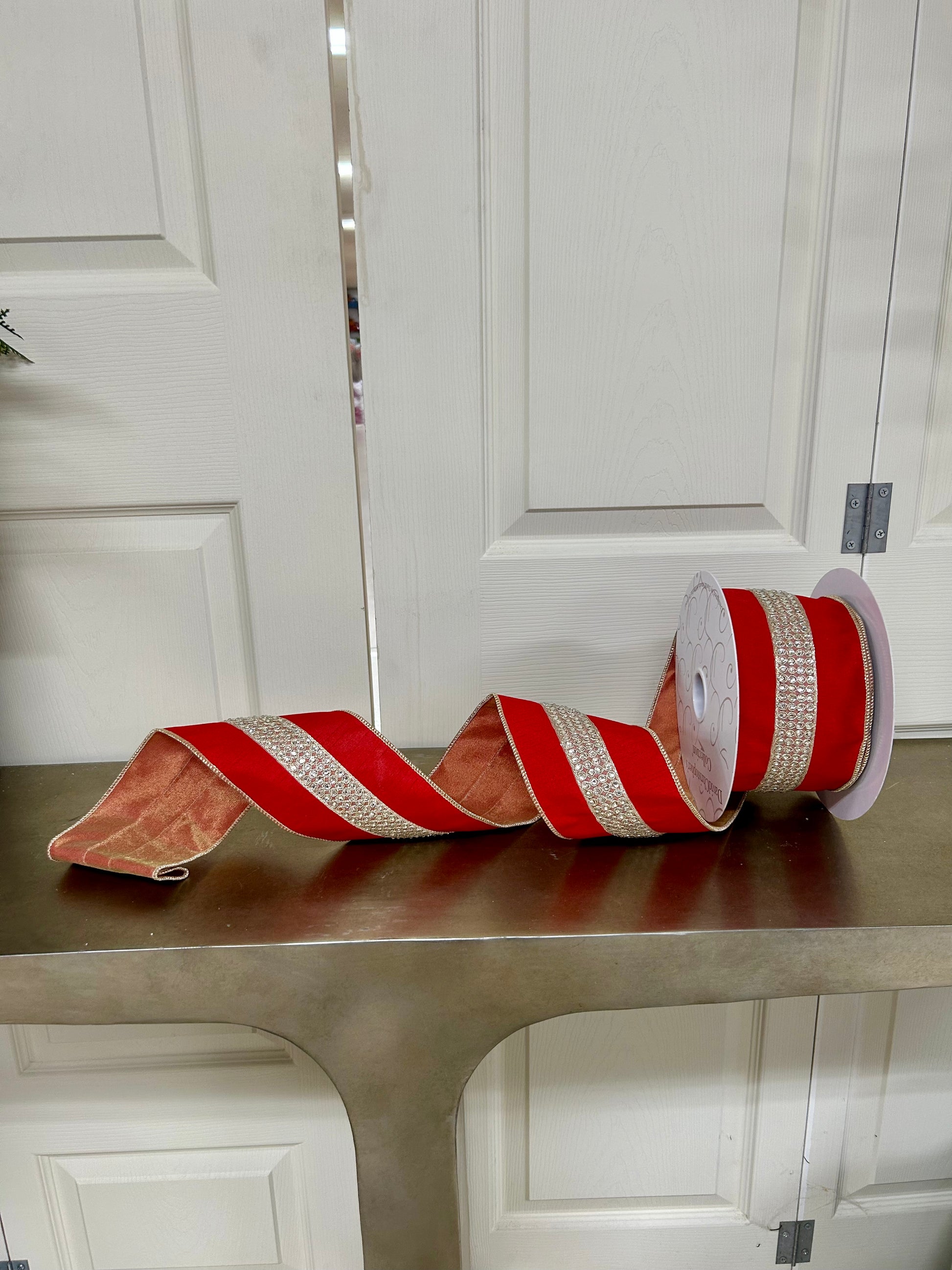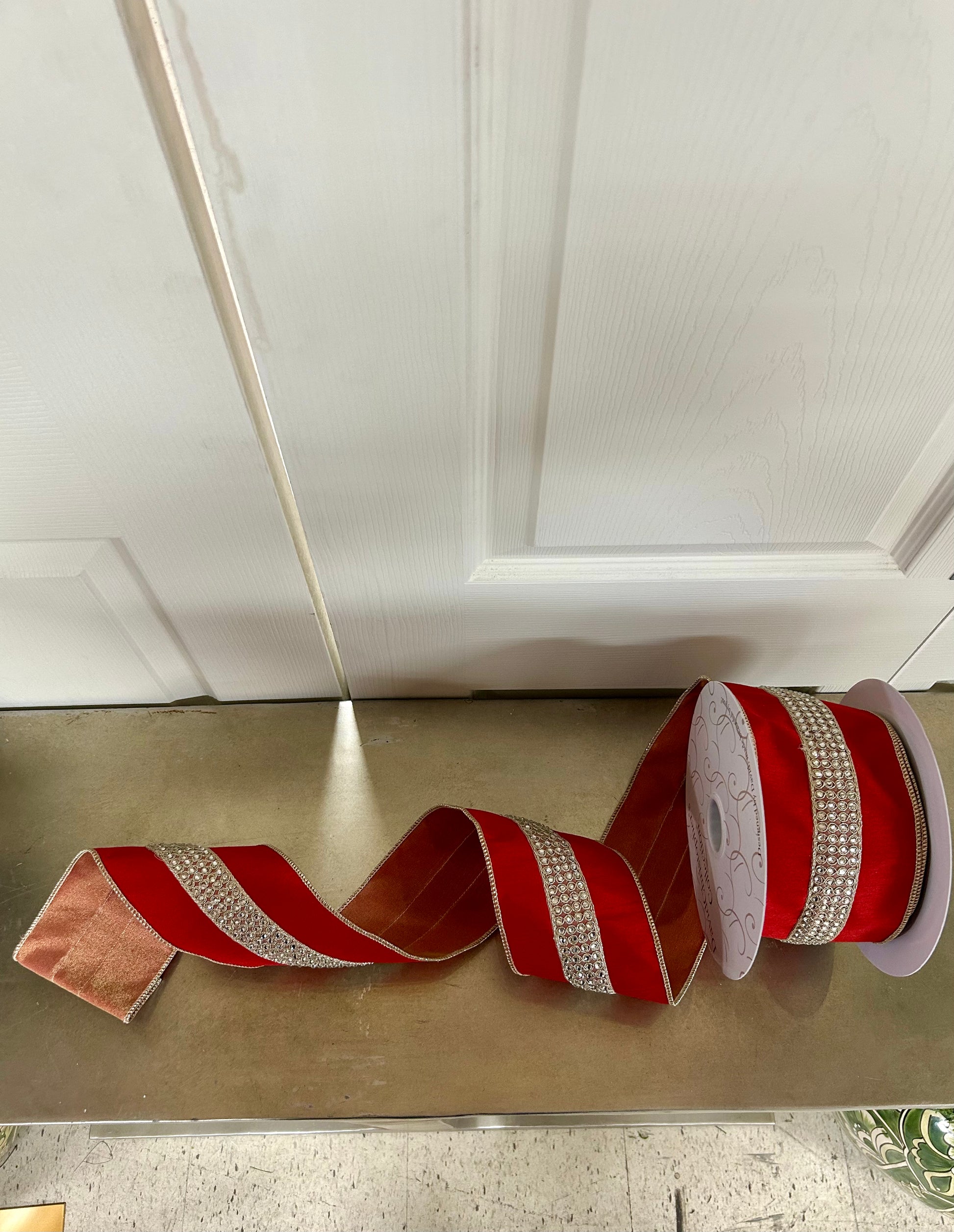 4 Inch By 10 Yard Red Faux Dupioni With Rhinestone Center Stripe Ribbon
