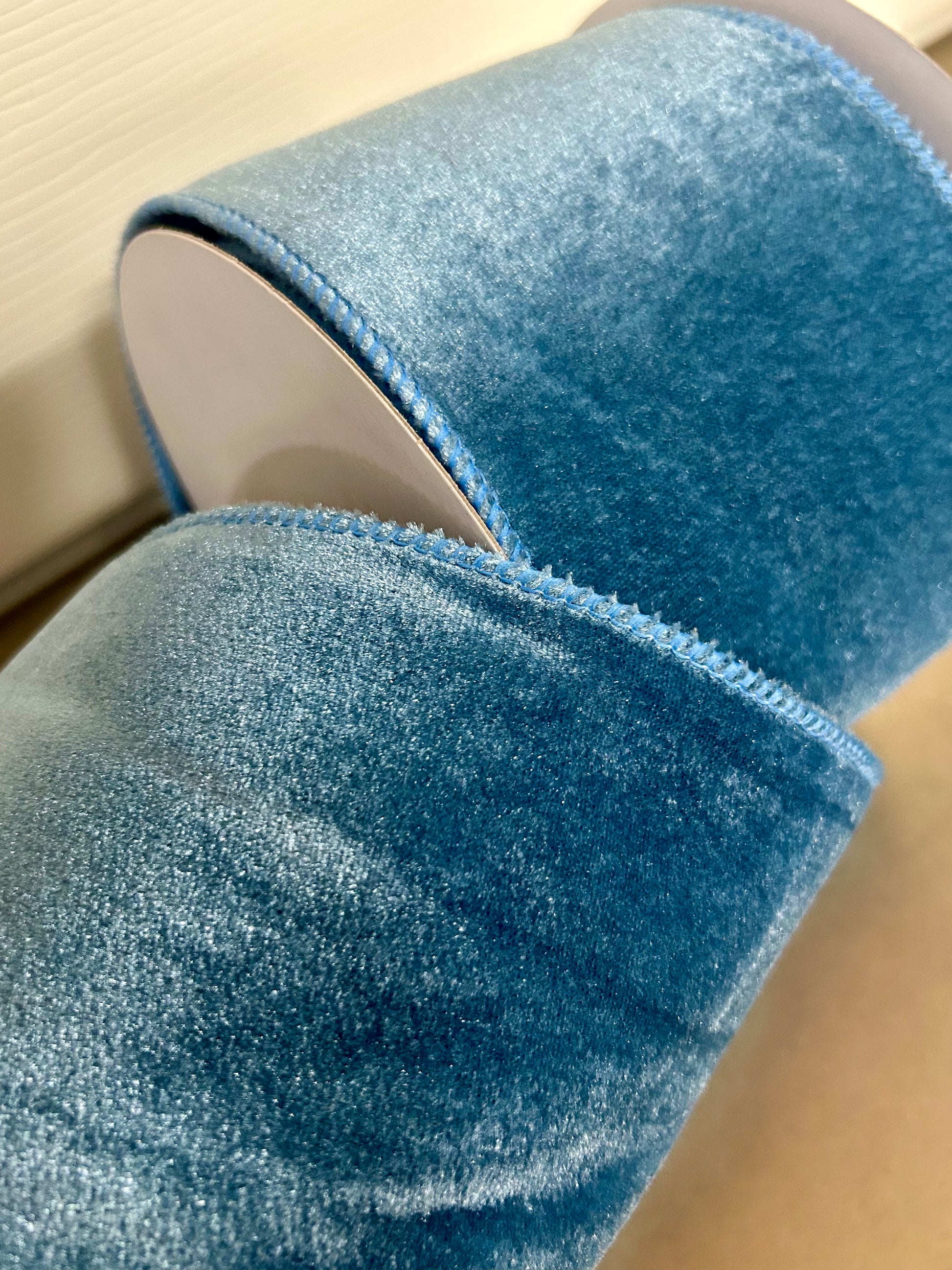 - This ribbon is a luxe and tactile delight! The front side is a smoke blue, super soft velvet while the back side is lined with thick, and silky smooth satin.