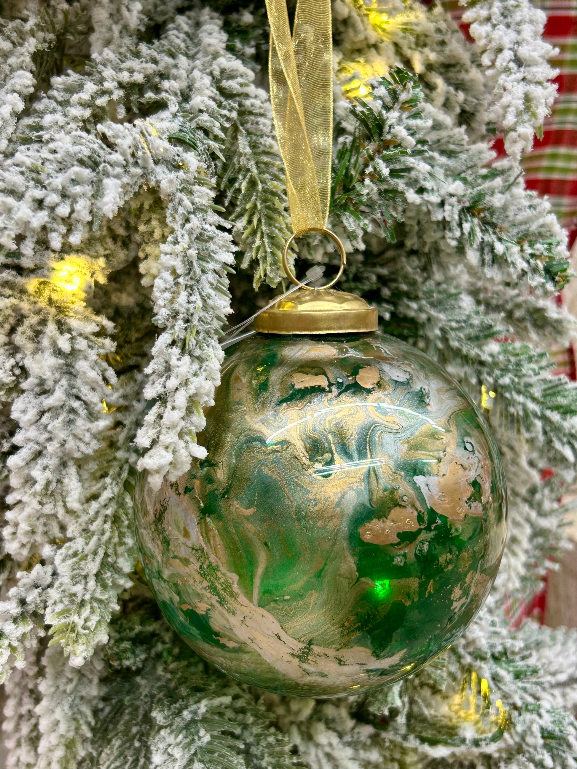 Elevate your holiday décor with this 4-inch glass ball ornament showcasing sophisticated hunter green, gold, and white marble swirls. Its elegant design adds a refined touch to fall and Christmas themes, making it perfect for enhancing your tree or seasonal displays. Durable yet delicate, this ornament combines classic charm with a contemporary marble effect for a timeless festive accent.