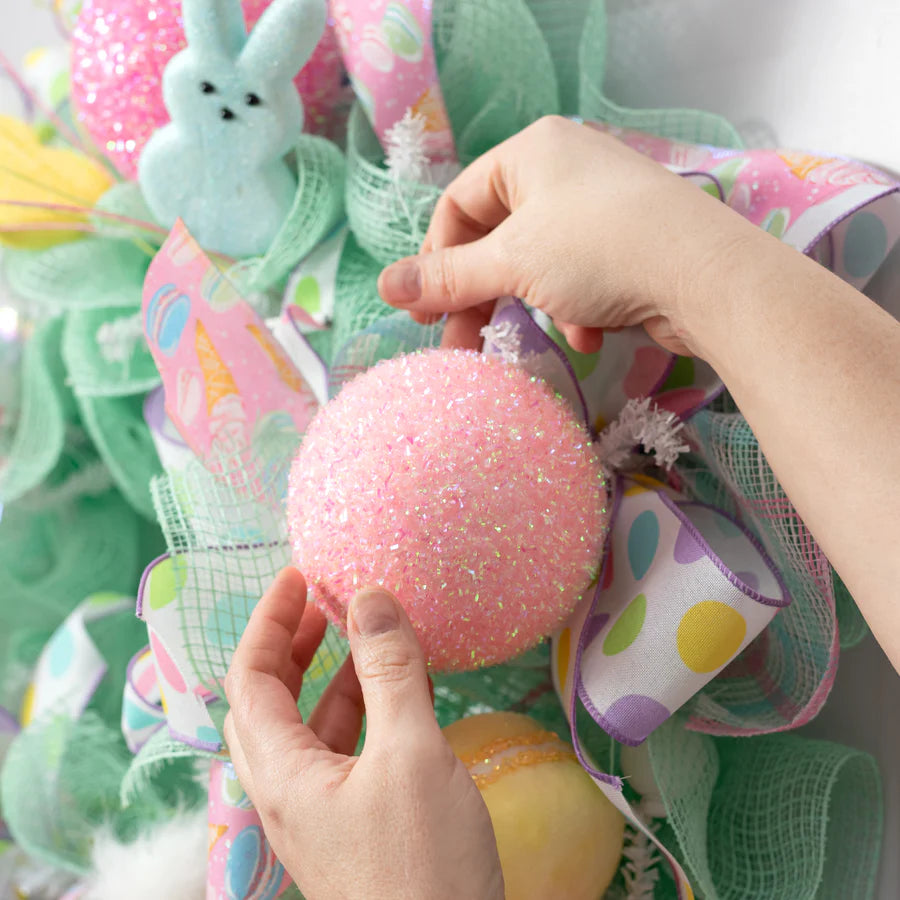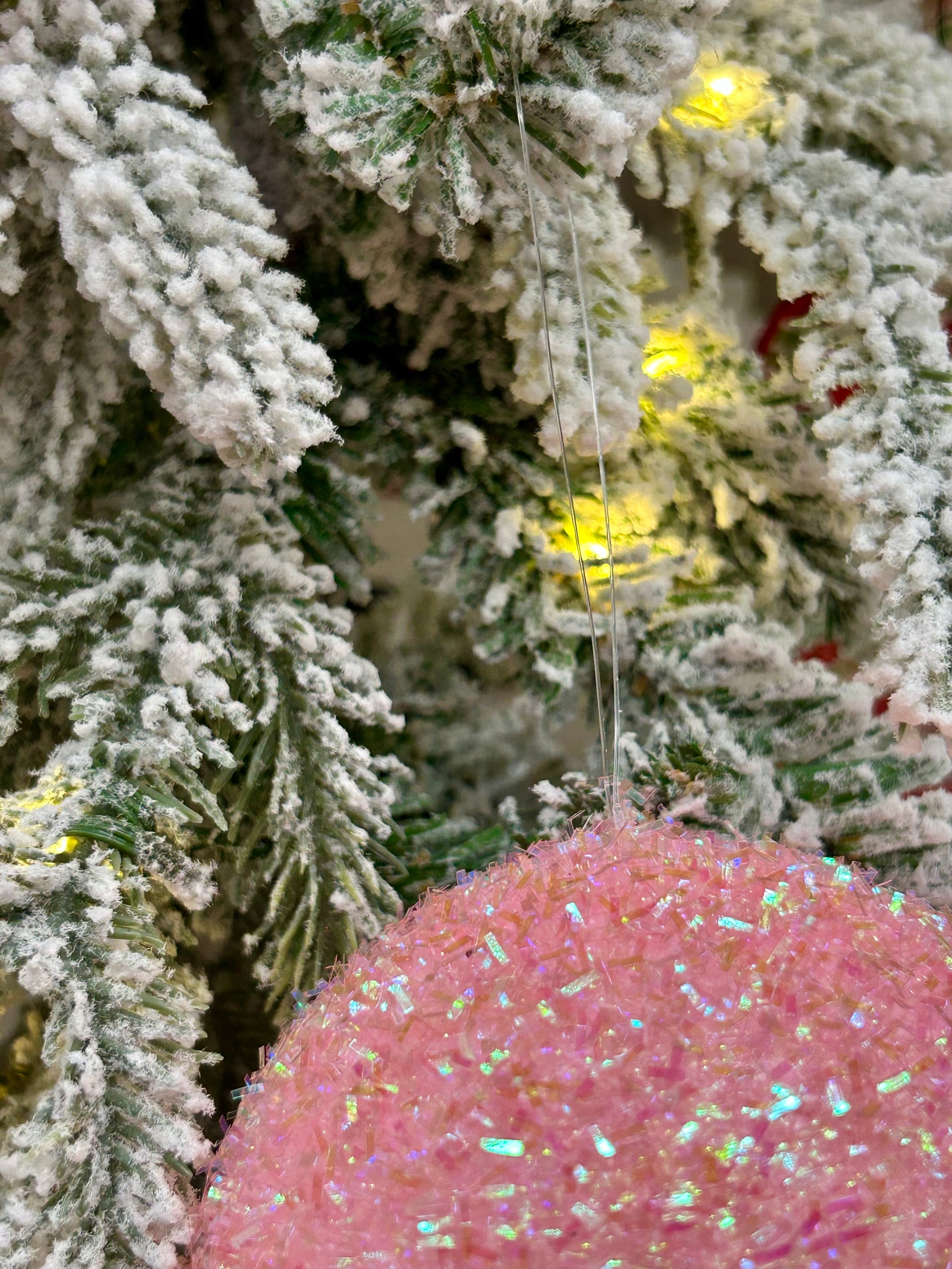 - This foam ornament is coated in three layers. The first is light pink paint, then a layer of iridescent glitter, and then it is topped with iridescent tinsel foil. The ornament has a fuzzy and very sparkly look. Perfect for Valentine's Day, Easter, Christmas, and any Cindy Lou Who themes!