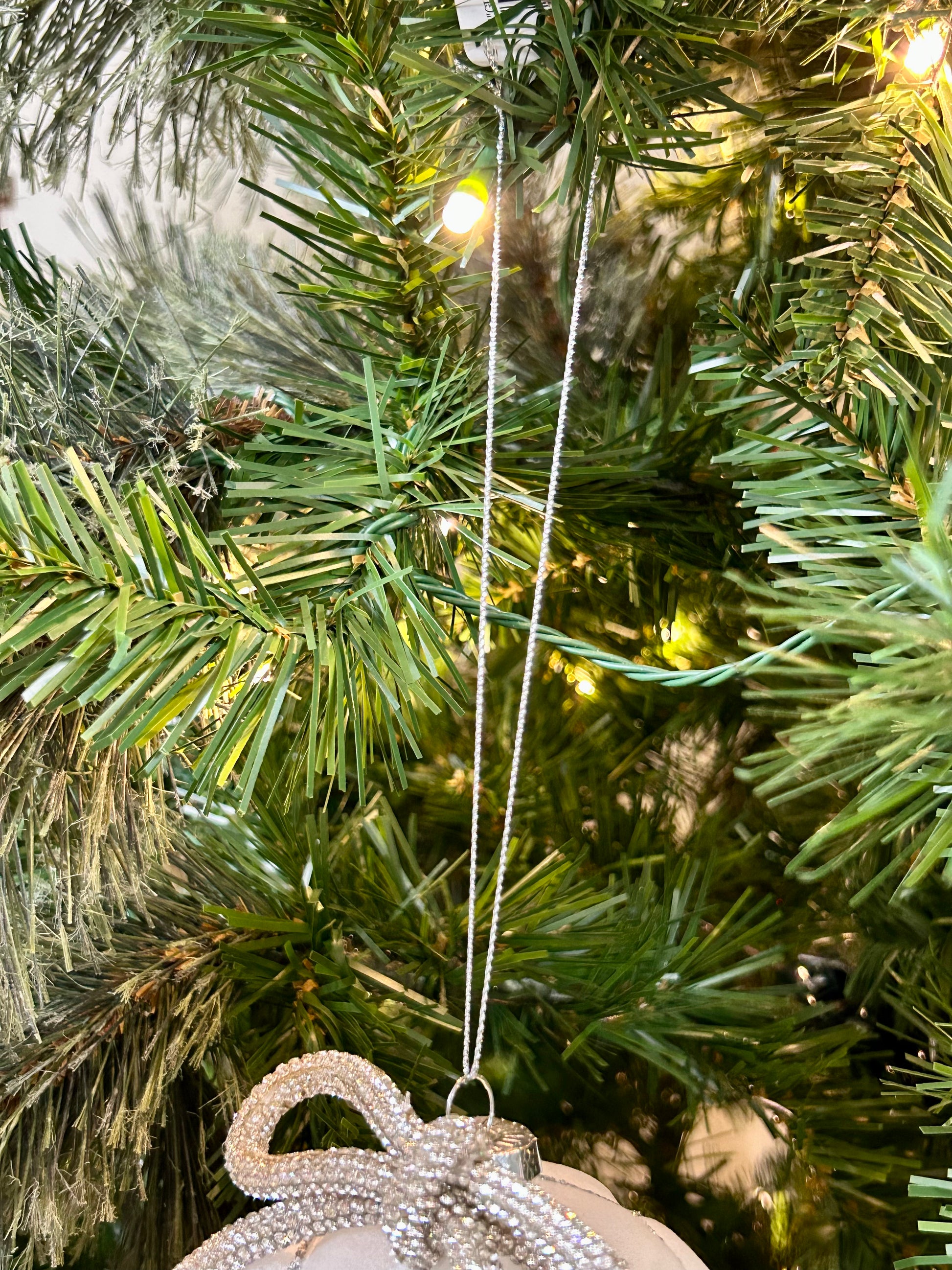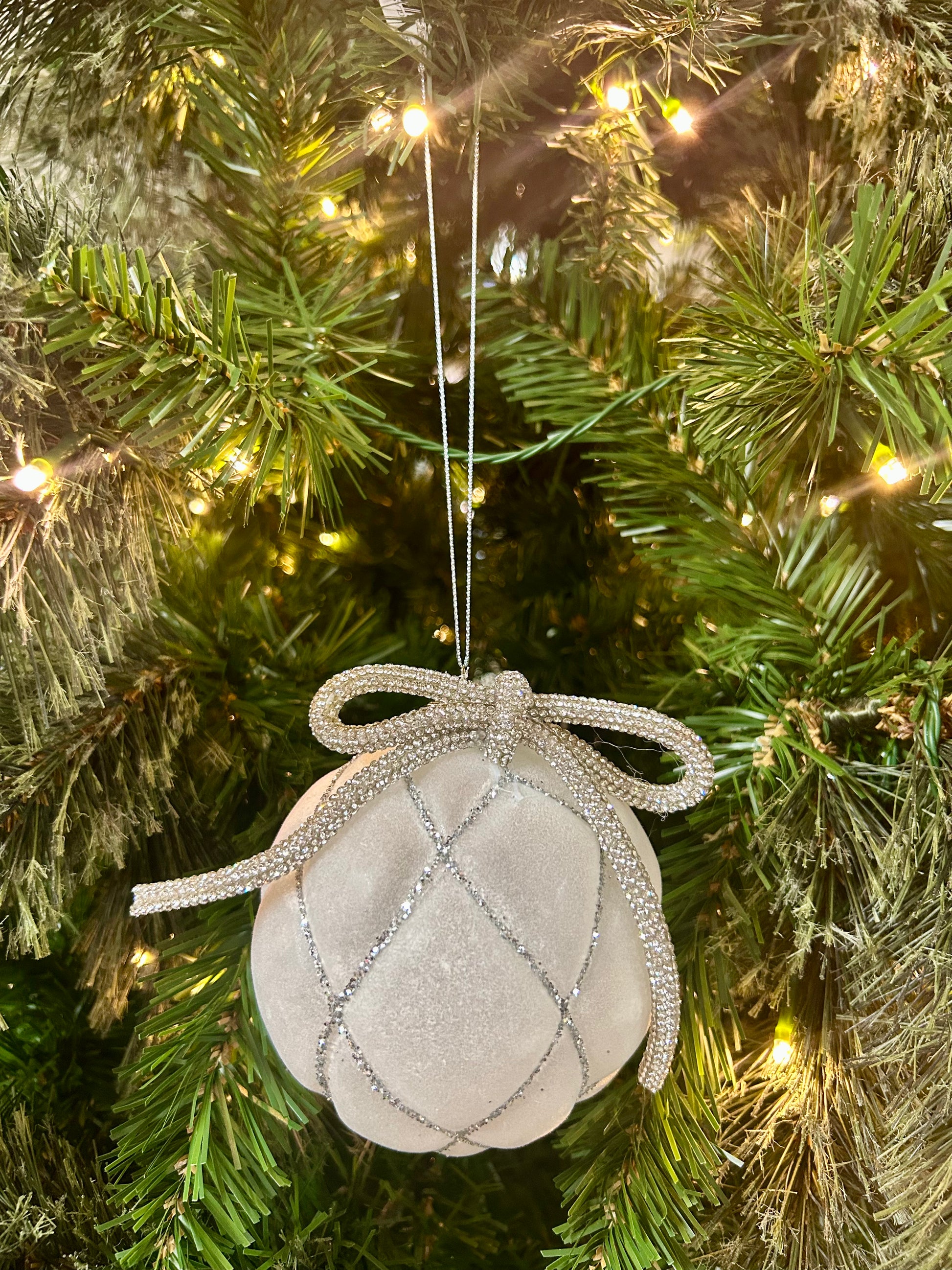 This 4-inch white flocked glass ornament features delicate silver glitter line details that add subtle shimmer. Topped with a silver sparkle bow accent, it brings an elegant touch to any Christmas tree. Its refined design offers a classic yet festive appeal, perfect for enhancing holiday décor with a sophisticated sparkle.