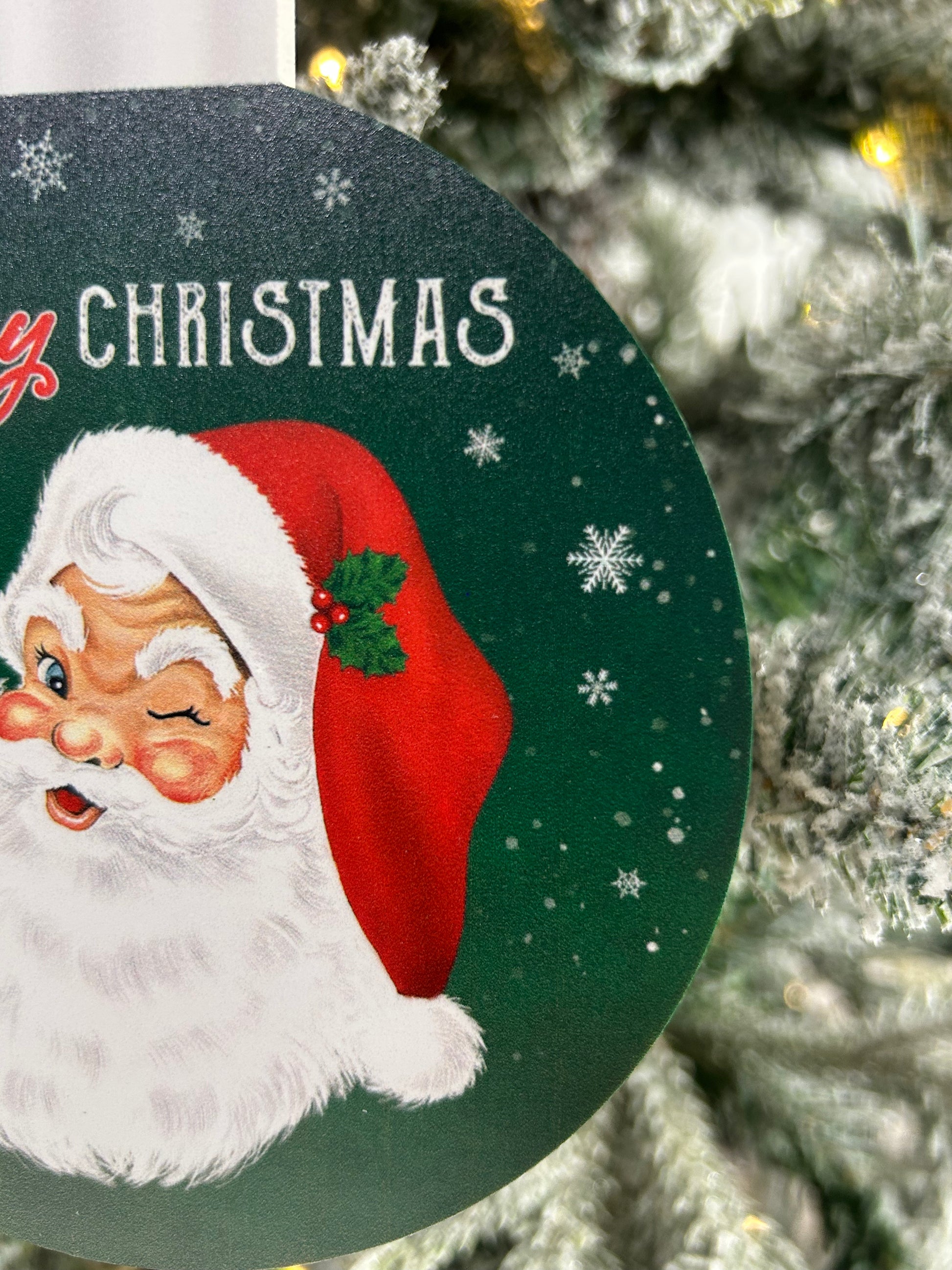 Celebrate the season with this charming 5.5-inch double-sided Santa ornament featuring two distinct vintage-inspired designs. One side showcases a jolly, winking Santa clutching a candy cane against a festive green background with "Merry Christmas" lettering. The reverse displays a classic Santa descending a chimney on a warm tan backdrop, complete with "Santa Stops Here" messaging. Perfect for tree display or as a nostalgic gift, this ornament combines timeless holiday imagery with quality craftsmanship, bringing warmth and whimsy to your seasonal décor.
