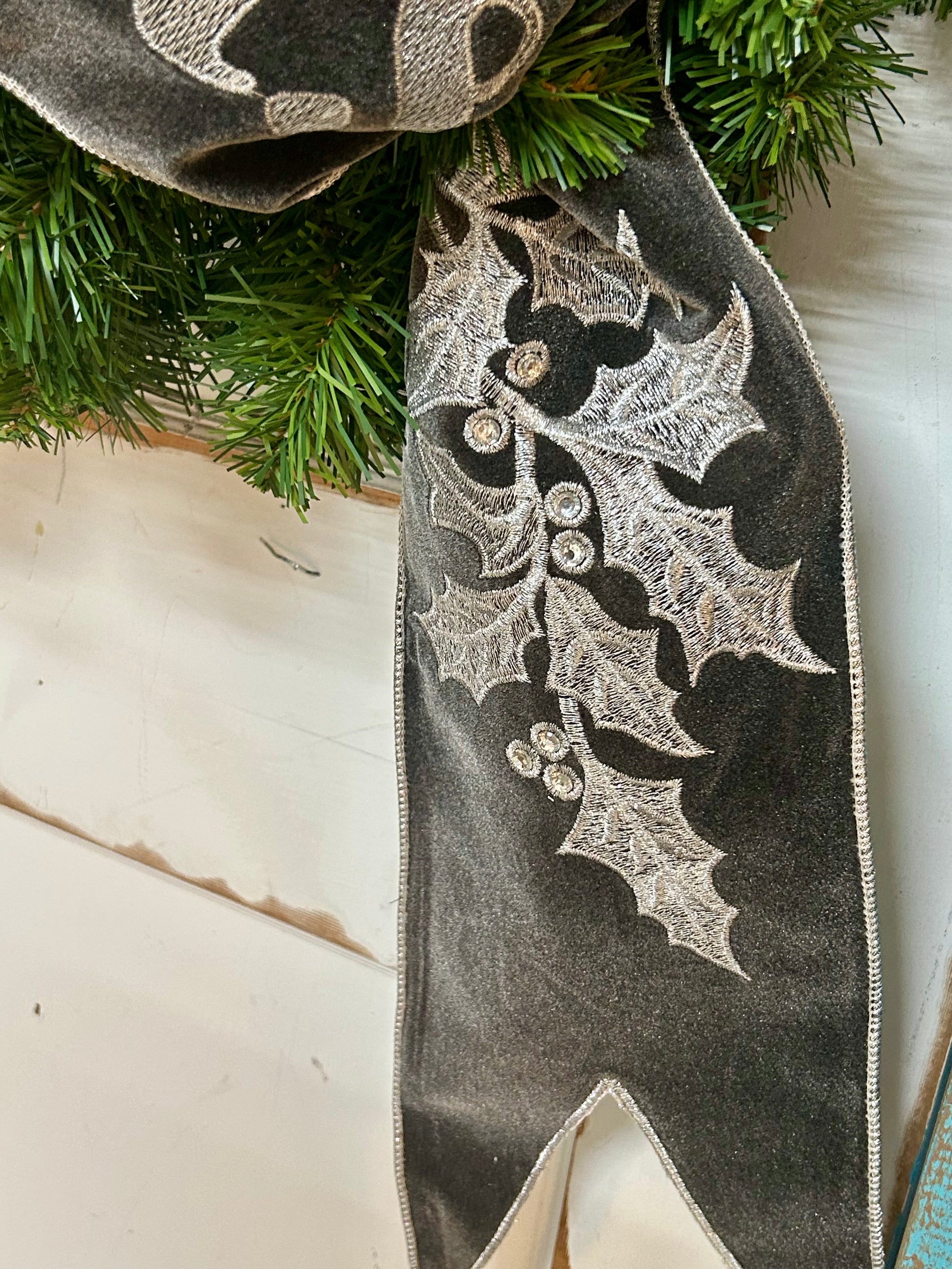 6 Inch By 70 Yard Grey Velvet Embroidery Jeweled Merry Christmas Banner
