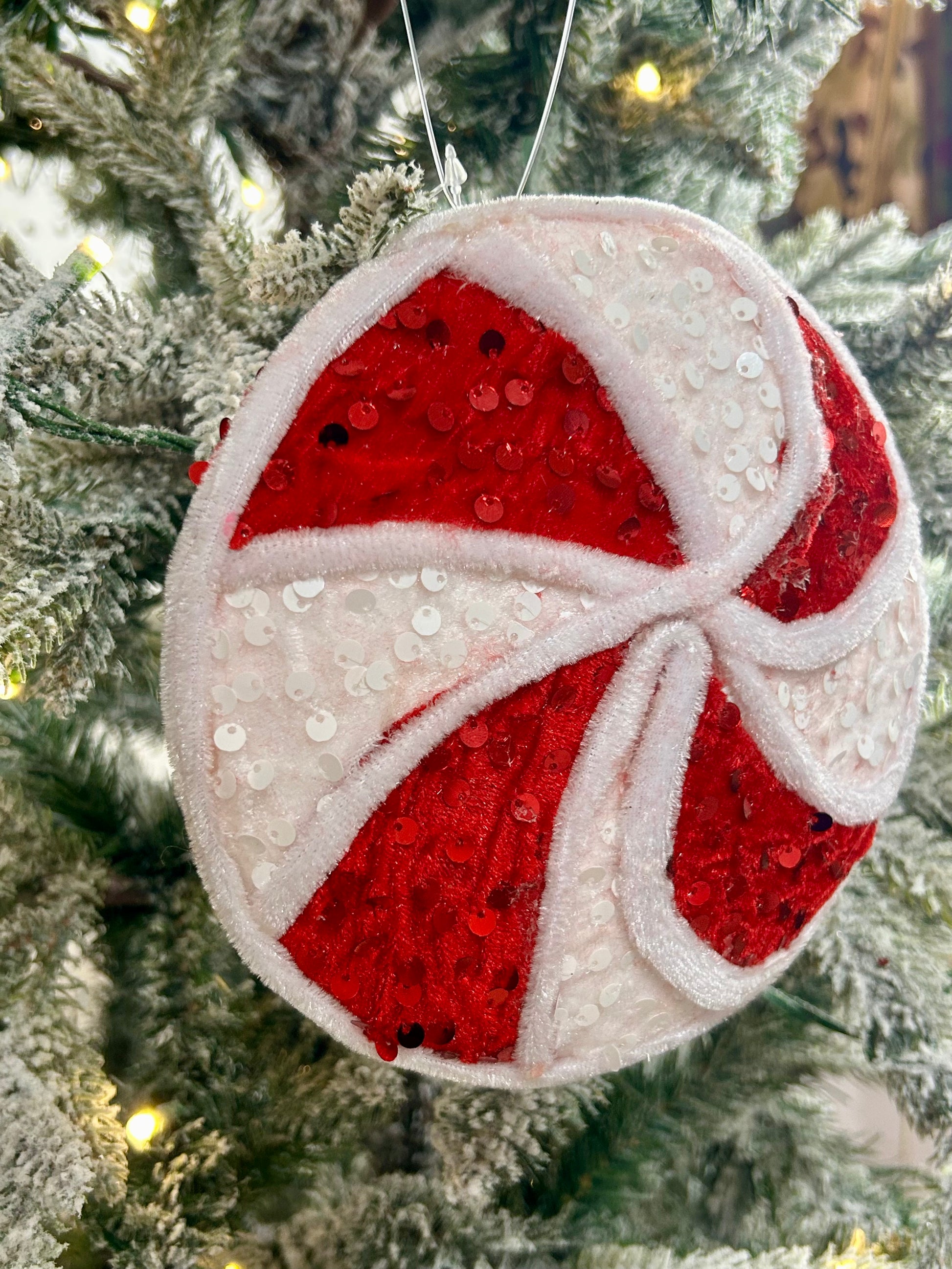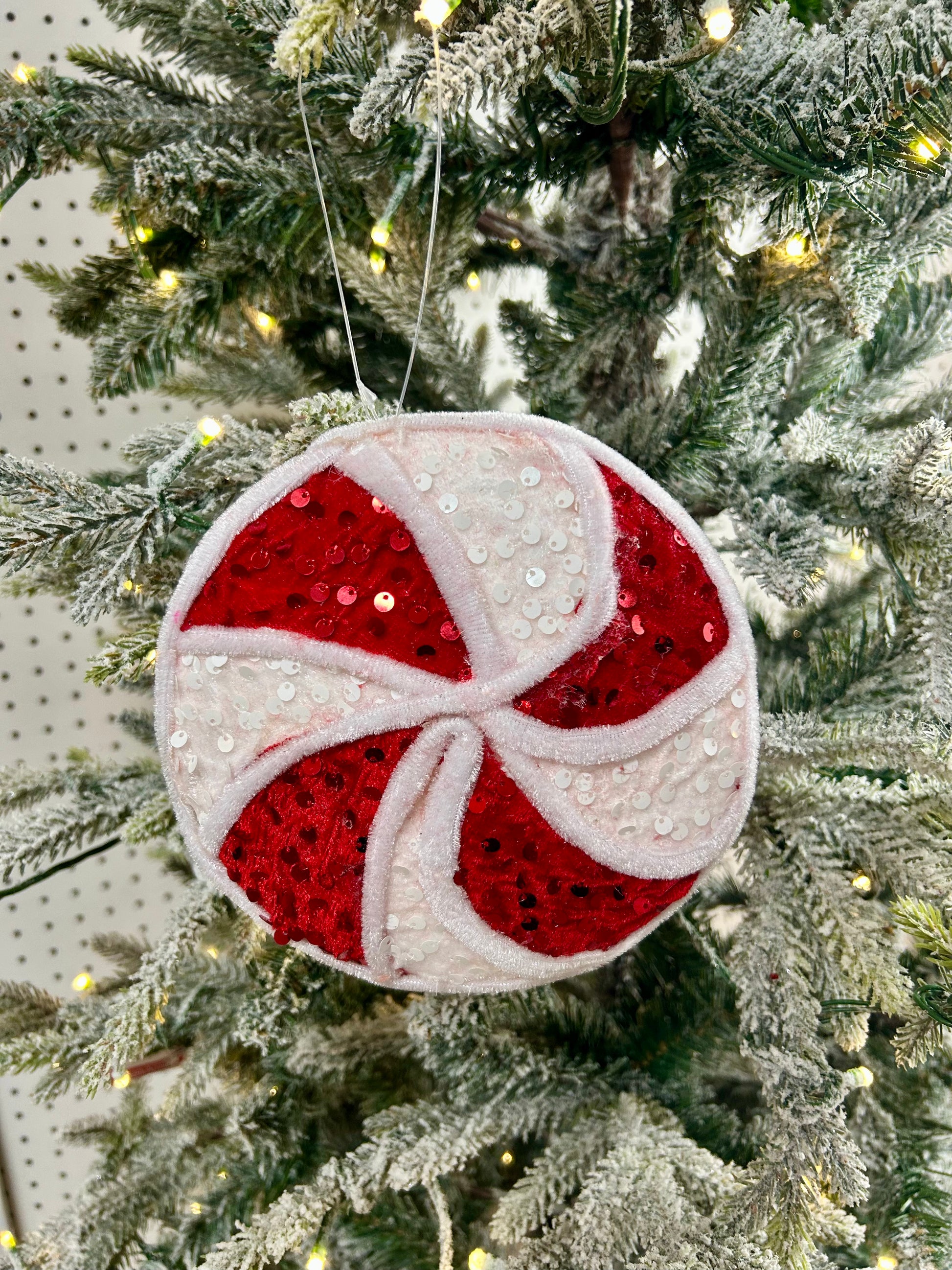 - Bring A Touch Of Whimsical Holiday Magic To Your Decor With This Festive, Double-Sided Peppermint Ornament. Made From Soft Velvet And Shimmering Sequins, This 6-Inch Diameter Pinwheel Is 0.75 Inches Thick, Giving It A Substantial Feel. The Classic Red And White Peppermint Pattern Is Perfect For Adding A Pop Of Color To Your Christmas Tree, A Wreath, Or A Garland. It Comes Ready To Hang With A Monofilament Hanger, Ensuring It Blends In Seamlessly With Your Other Decorations.