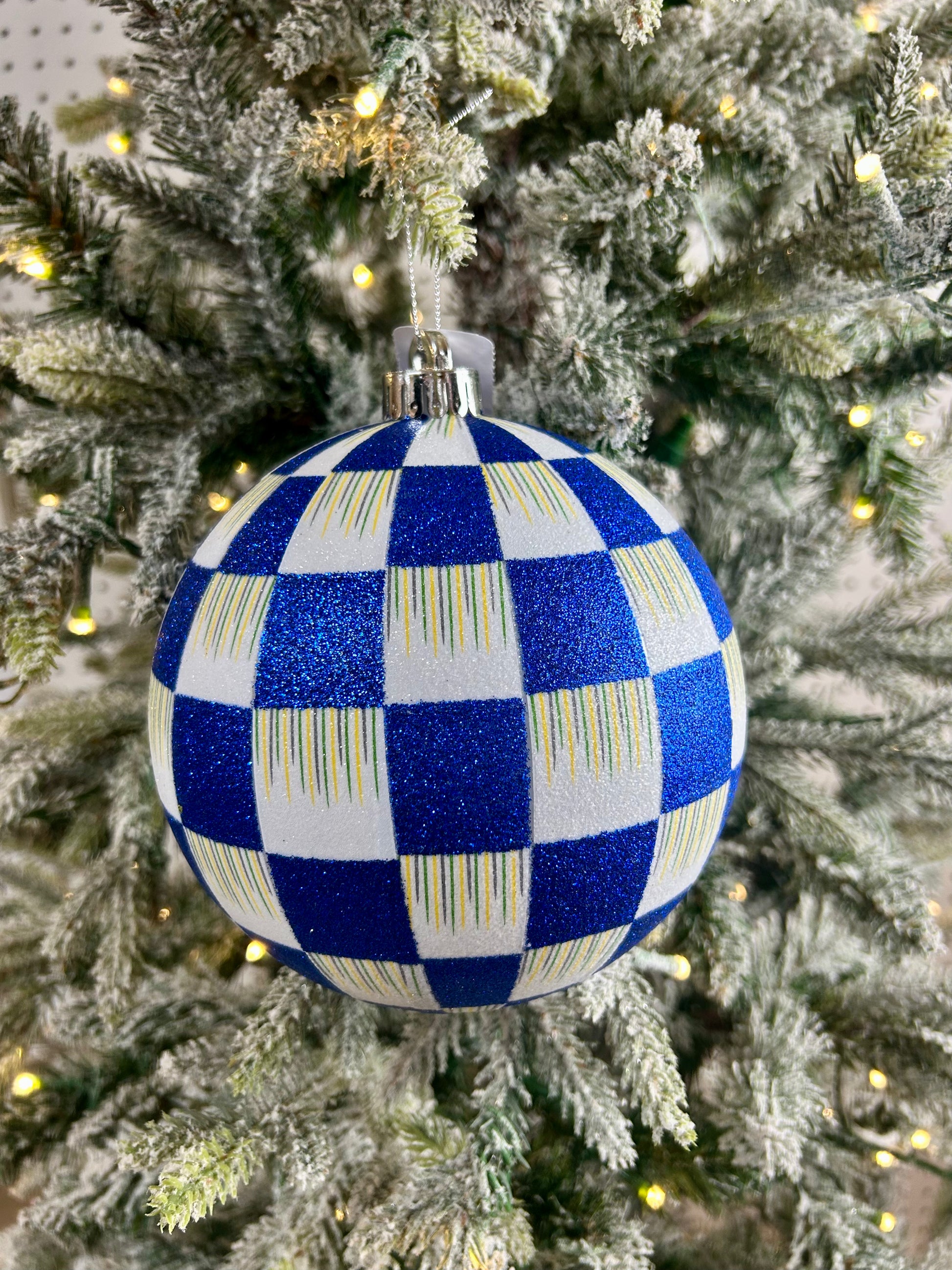 Elevate your holiday décor with this striking 6-inch ornament, featuring a sophisticated royal blue and white glitter check pattern. The shimmering finish catches light beautifully, adding dimension and elegance to any tree. Versatile enough for patriotic displays, autumn arrangements, or classic Christmas settings, this statement piece brings refined style to seasonal celebrations. Its generous size ensures it commands attention among smaller ornaments, making it an ideal focal point for your festive collection.