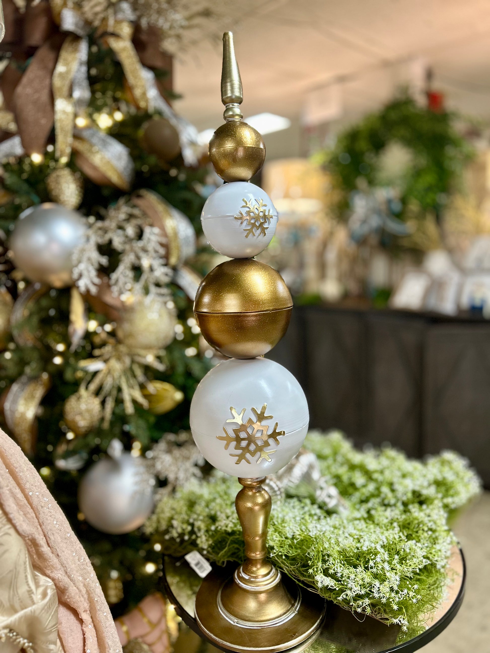 Elevate your holiday décor with this Large Metal Gold and White Snowflake Topiary Stand. Measuring 37 inches tall, it features an elegant gold and white snowflake design that adds a festive yet sophisticated touch to any space. Perfect for creating a striking centerpiece or accent, this durable metal stand combines seasonal charm with timeless style to enhance your Christmas decorations effortlessly.