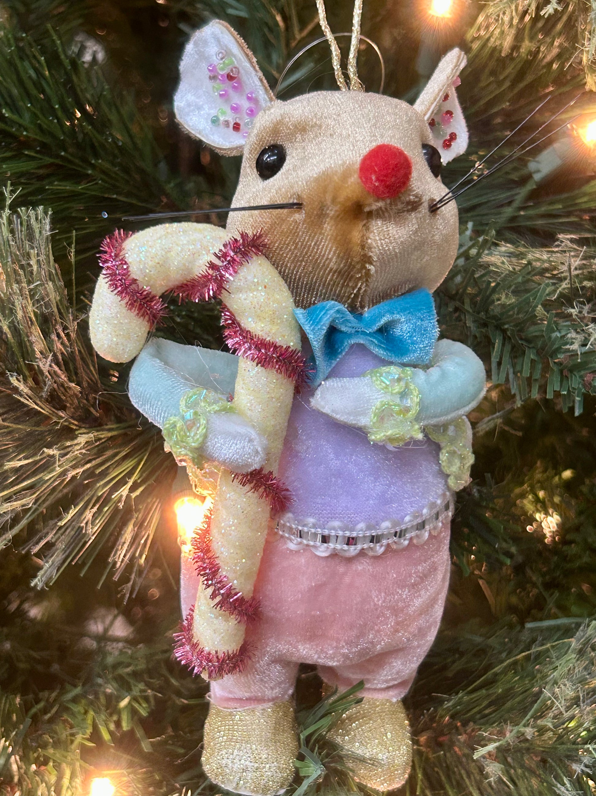 This 6-inch Mark Roberts pastel mouse ornament features a delicate velvet fabric that adds a soft, luxurious texture. Perfect for Christmas décor, this charming felt mouse holds a candy cane, bringing a festive touch to your holiday display. Its detailed craftsmanship makes it a refined addition to any ornament collection.