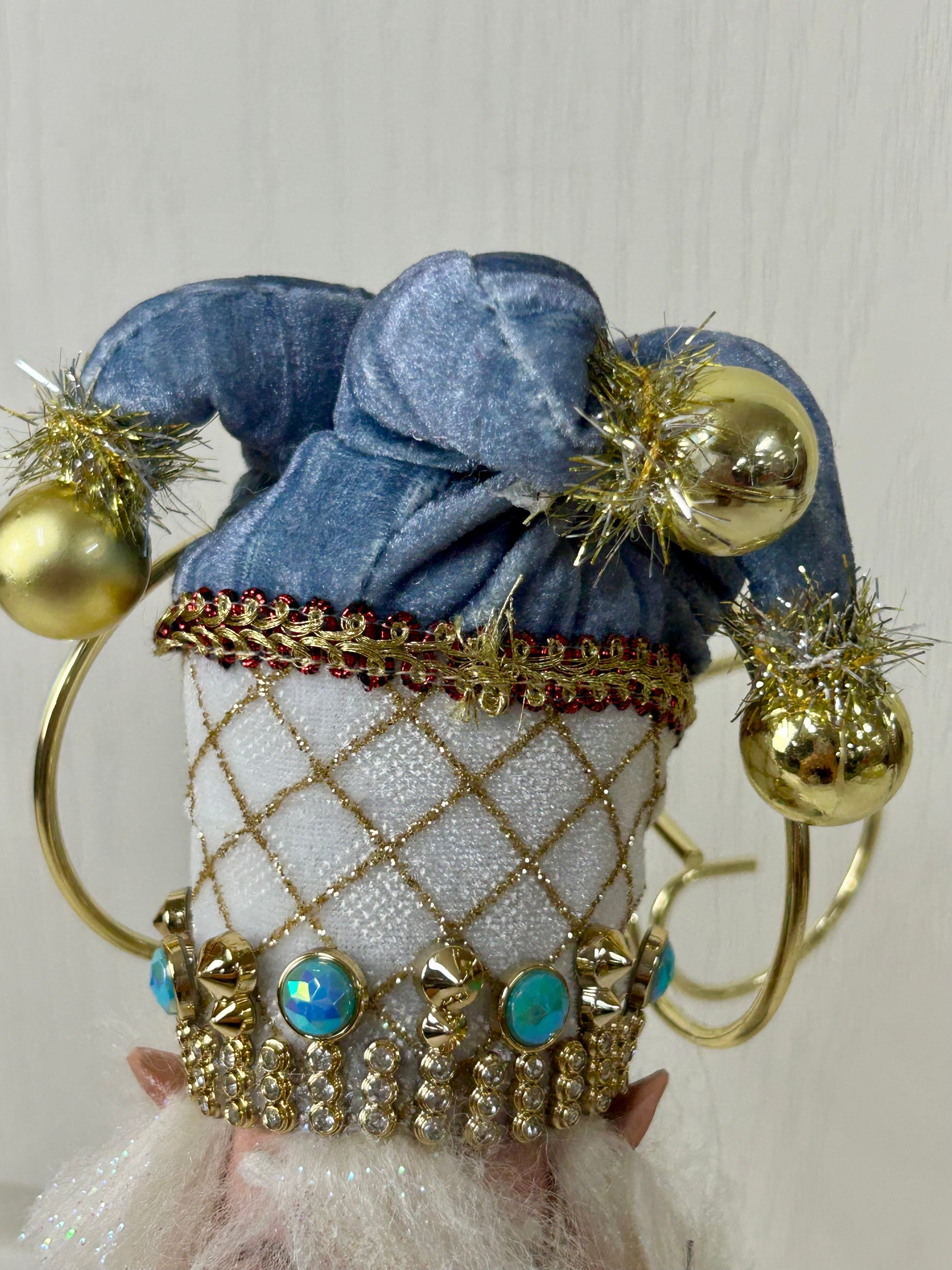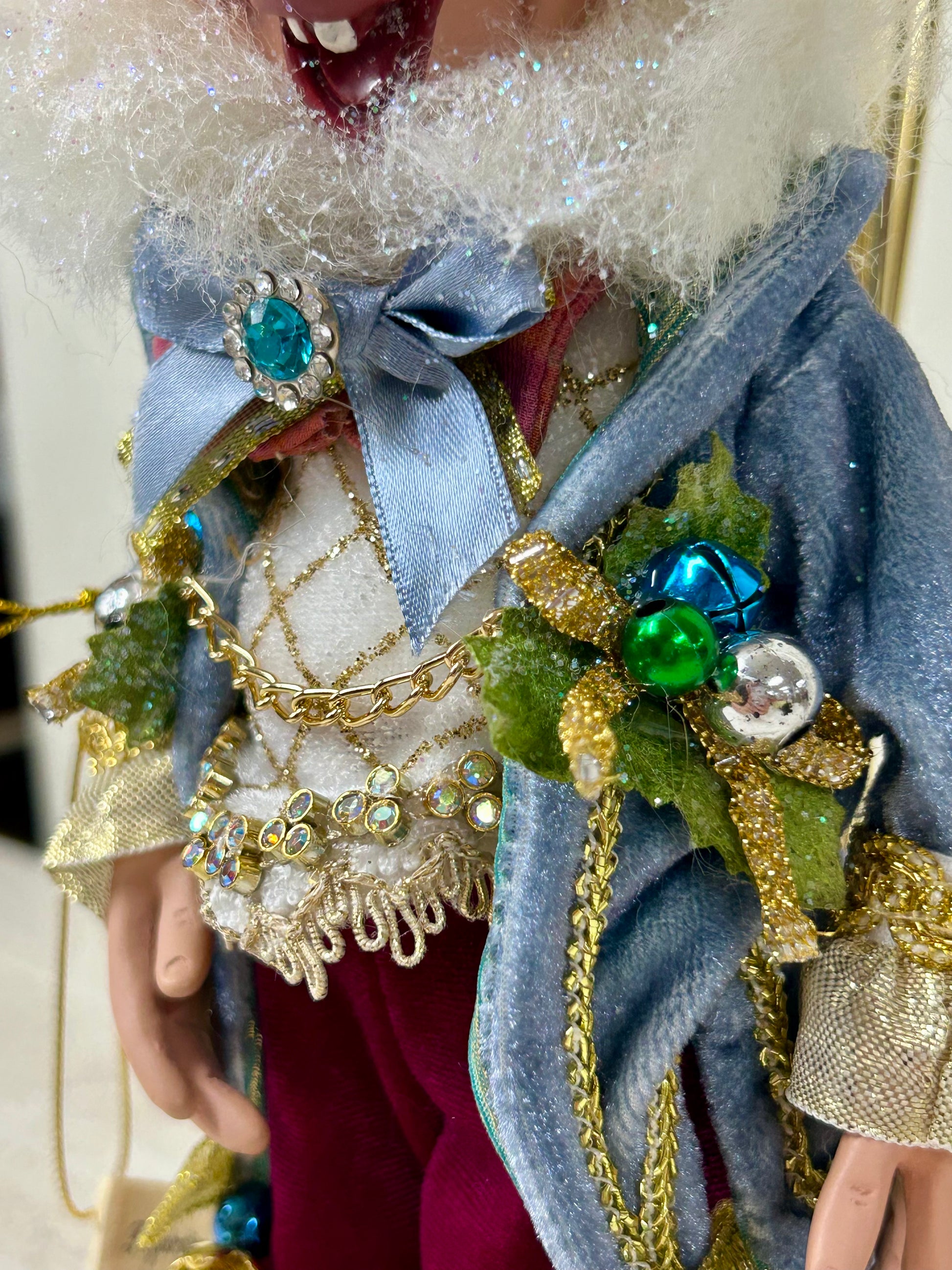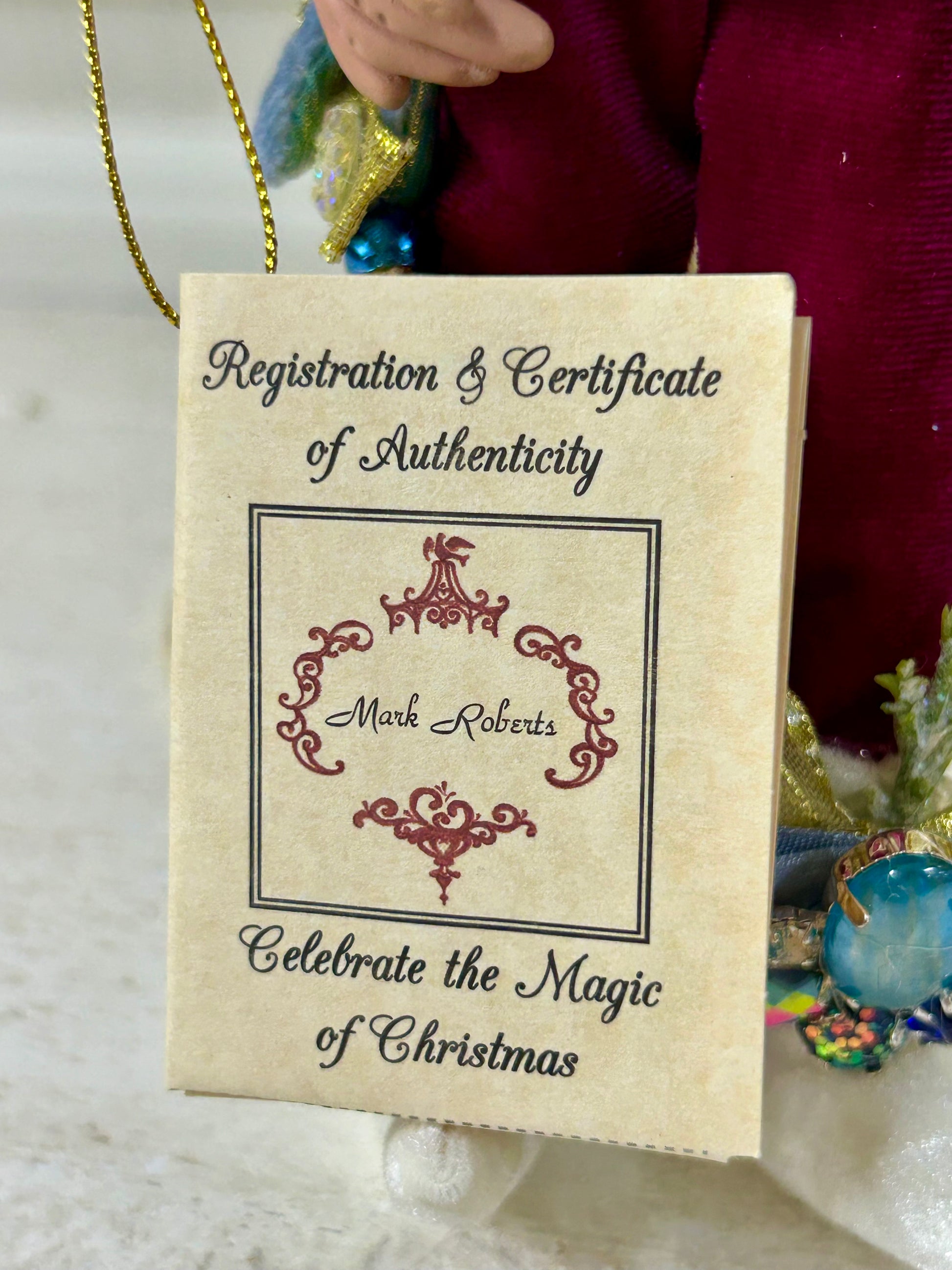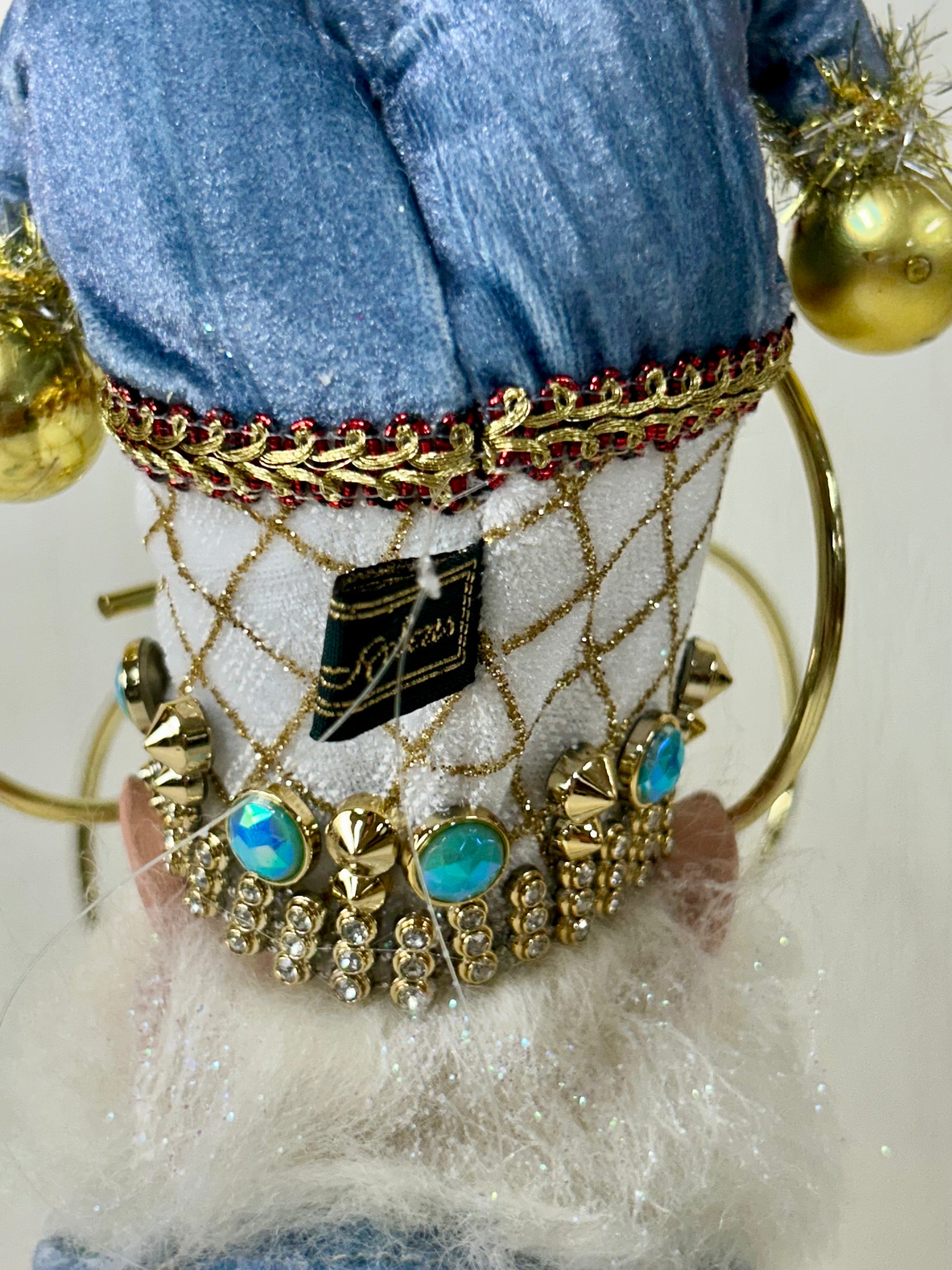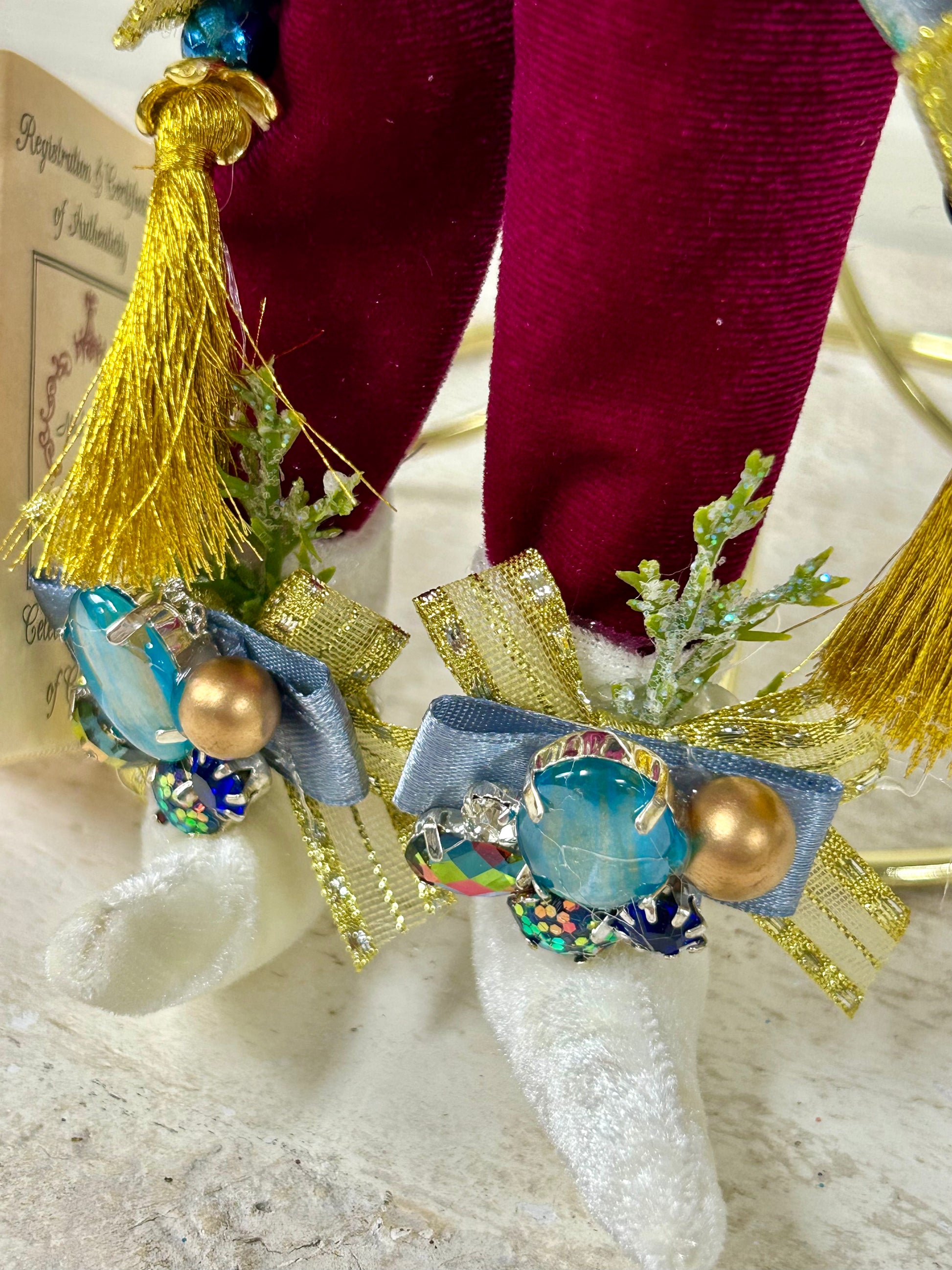 This 12.5-inch Mark Roberts Joyful Elf features a richly detailed jacket adorned with jewel ornament balls, tassels, and a gold chain. Combining fuchsia, ivory, royal blue, ice blue, and gold hues. Expertly crafted, this festive figure adds a sophisticated touch to holiday décor with its vibrant colors and intricate embellishments.