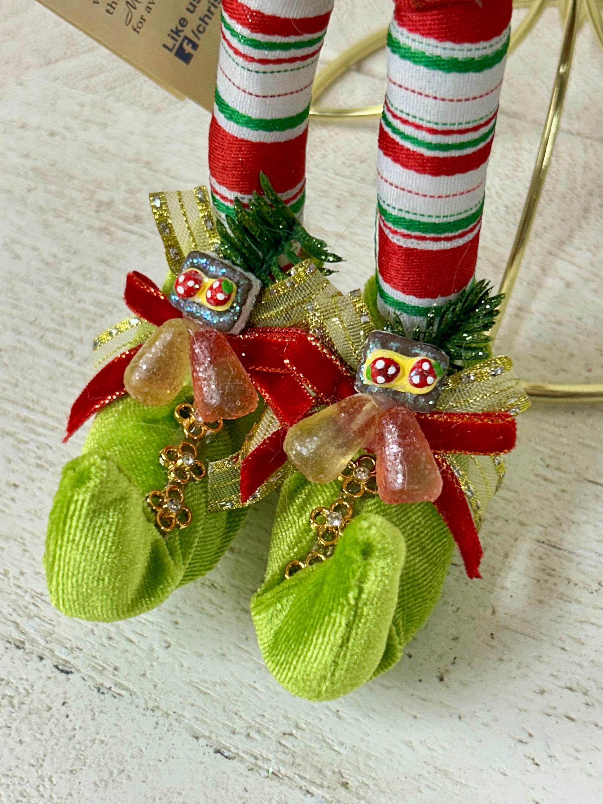 The Mark Roberts Small 14 Inch Northpole Confectioner Elf is a finely detailed collectible crafted from luxurious velvet. This elf features vibrant red, white, and green striped leggings paired with matching plaid shorts, enhanced by elegant gold accents and plaid bow details. Its lime green pointed shoes and ivory confectioner hat add a festive touch, while orange and yellow gumdrops and a gingerbread accent complete the charming confectioner theme. Perfect for discerning collectors, this piece embodies expert artistry and holiday spirit.