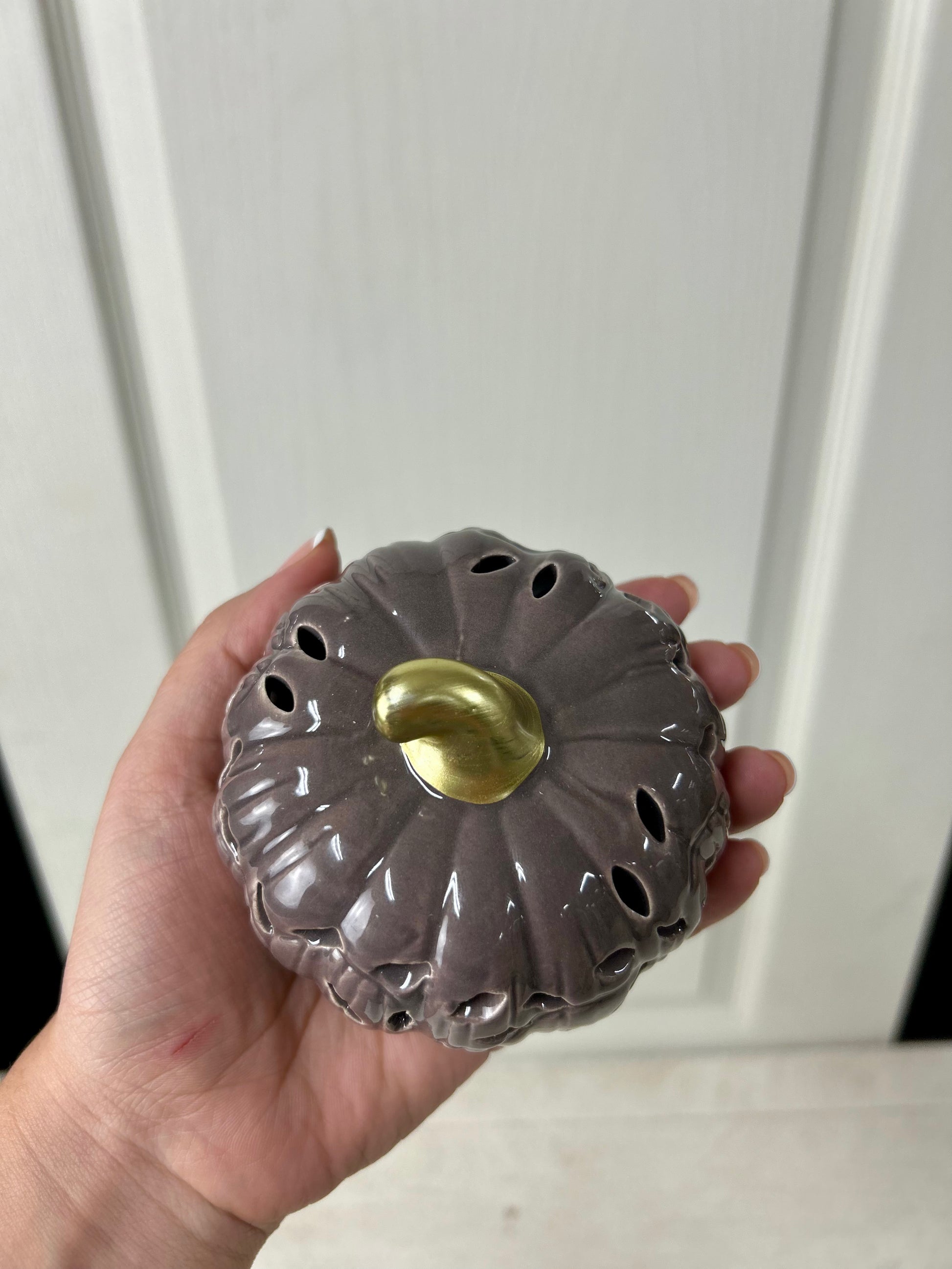 This mini ceramic pumpkin in a sophisticated grey hue offers a subtle yet stylish accent for your fall decor. Its compact size makes it perfect for tabletops, shelves, or mantel displays, adding seasonal charm without overwhelming your space. Crafted from durable ceramic, it combines aesthetic appeal with lasting quality, making it an expert choice for enhancing autumnal ambiance.