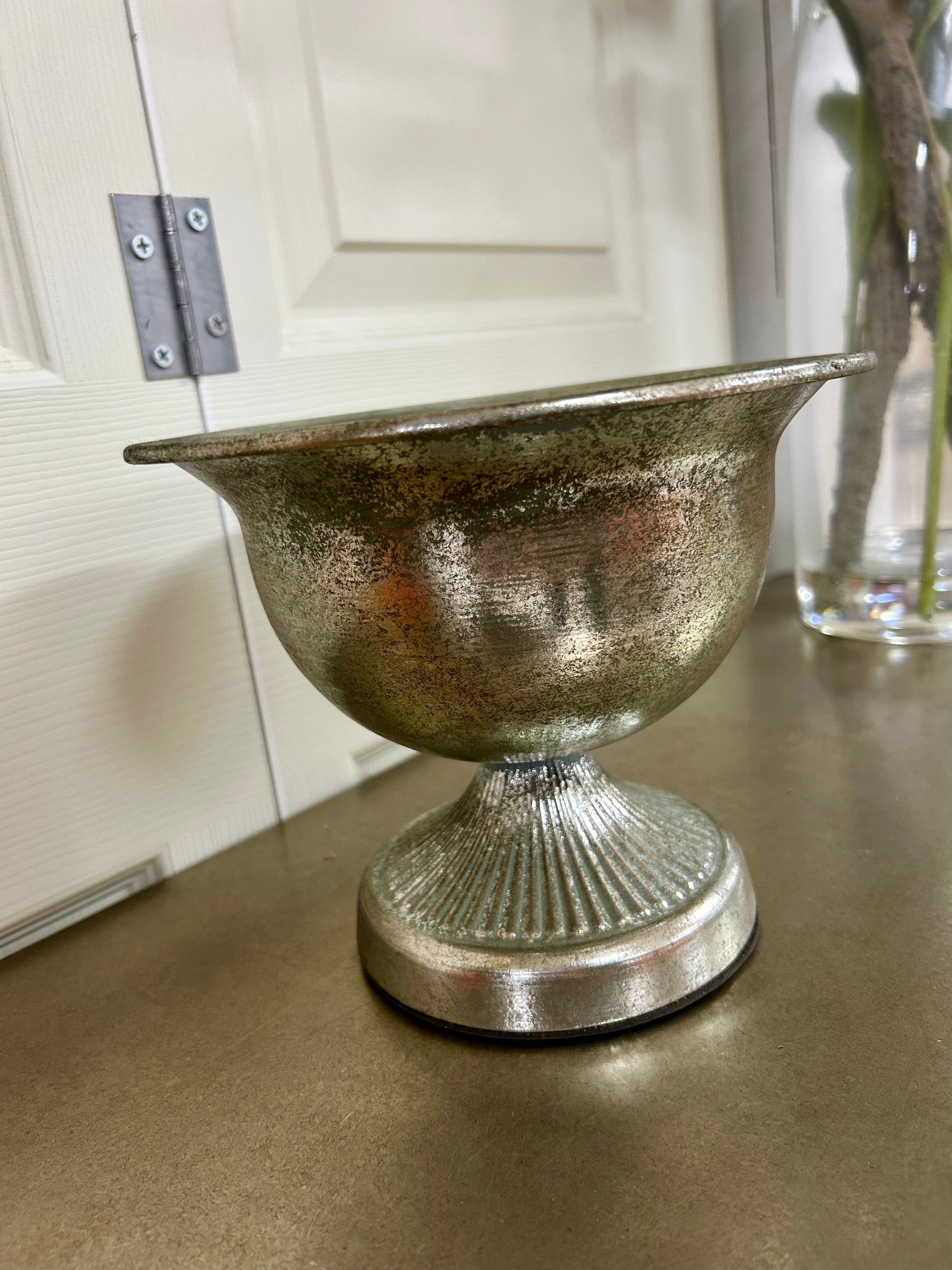 - Add some rustic charm to your decor with this silver distressed metal urn!