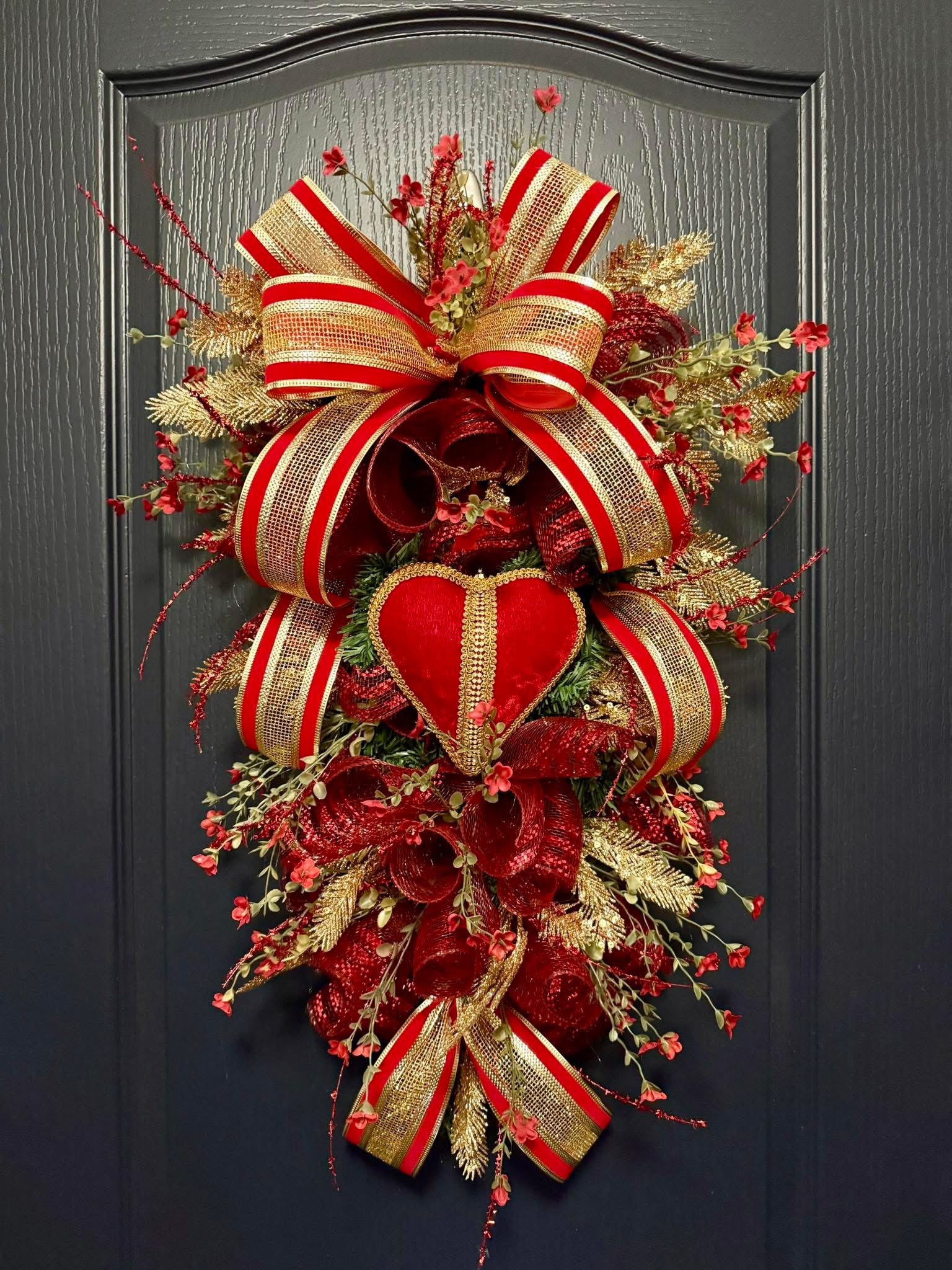 - This Kit Includes: (1) 24 Inch Evergreen Teardrop, (1) 7 Inch Red Velvet Heart, (1) 2.5 Inch Red And Gold Ribbon, (1) 10 Inch Burgundy With Red Foil Netting, (1) 19.5 Red Waxflower Bush, (2) 32 Inch Red Pine Glitter Spray, and (3) 24 Inch Gold Peacock Glitter Fern Spray